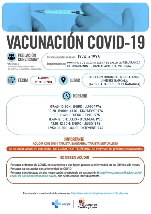, con fecha de nacimiento comprendidas entre los años 1974 a 1976, ósea la población con edades entre 45 y 47 años, distribuidos en una jornada que se desarrollara por horarios y mes de nacimiento, tal y como indica la organización
