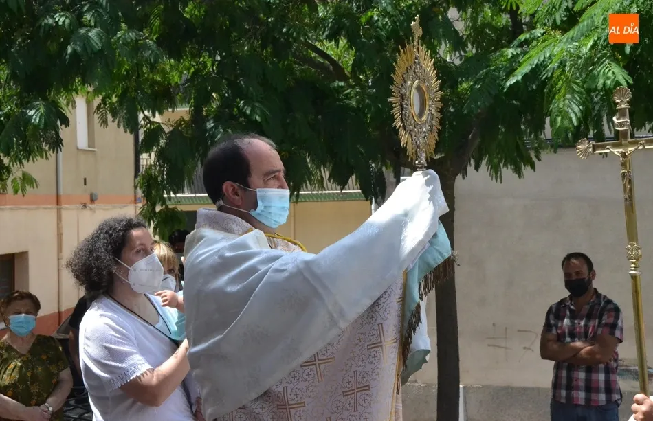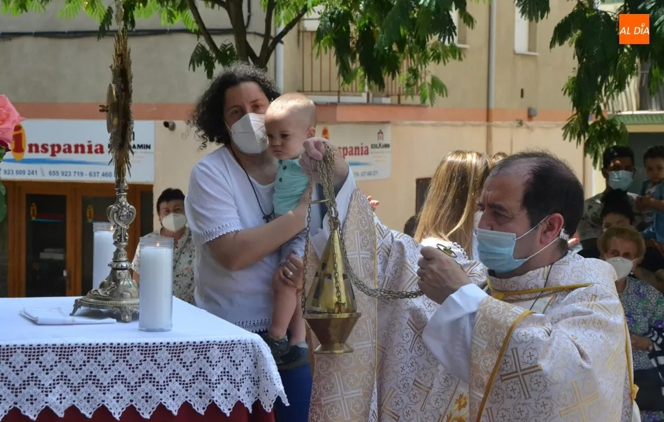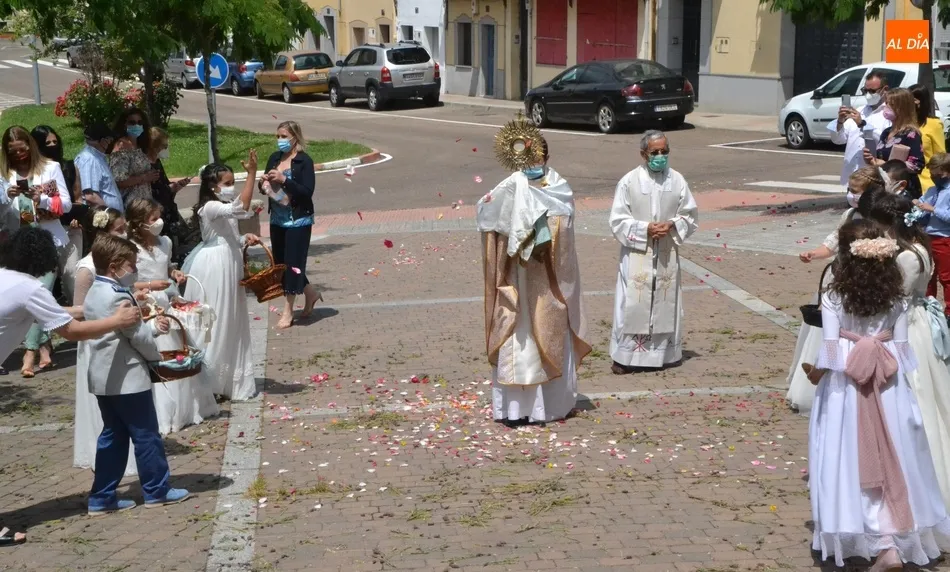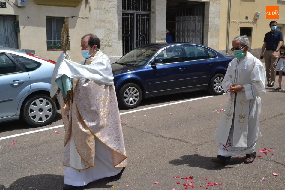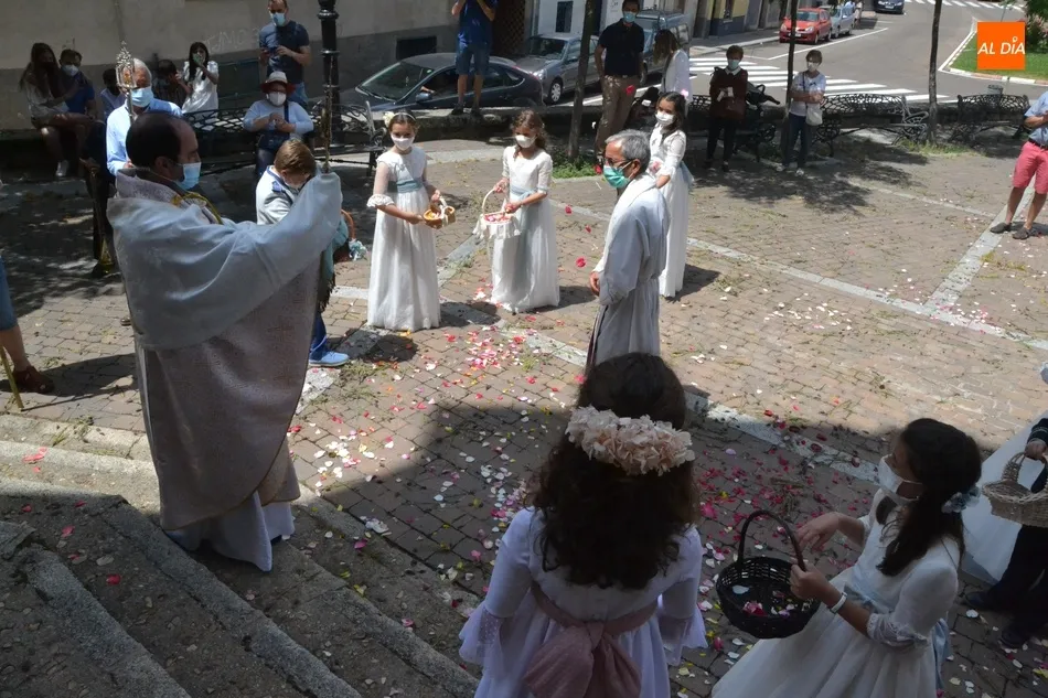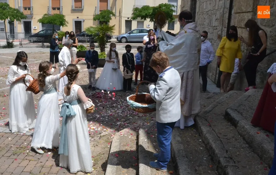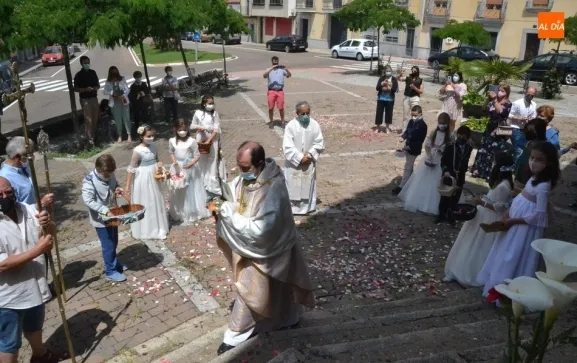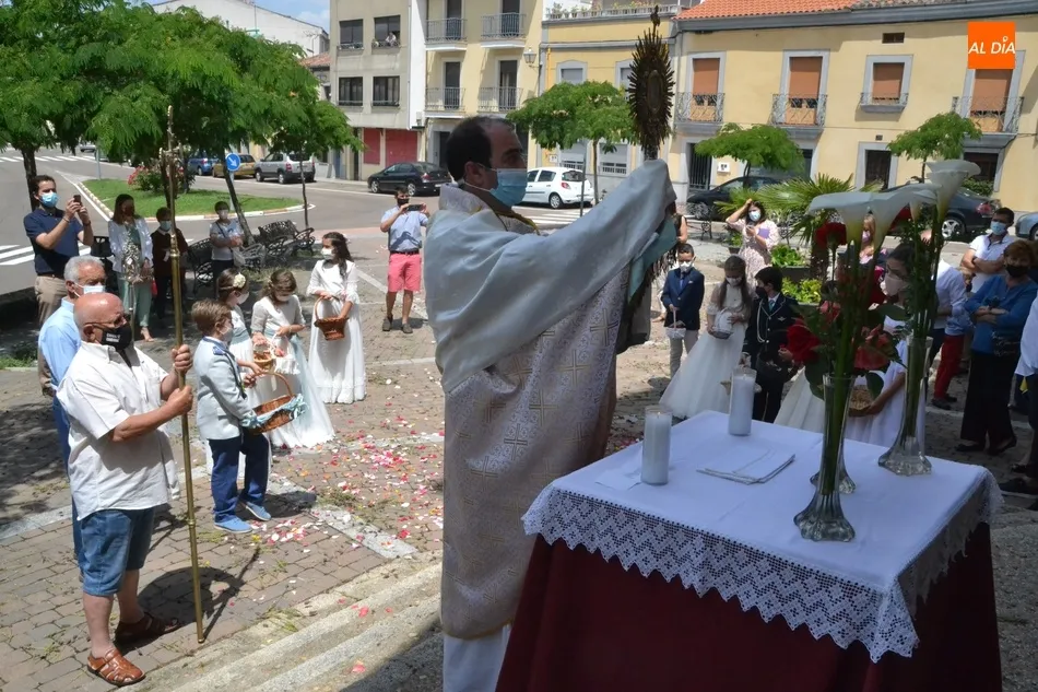 Como marca la tradición en Ciudad Rodrigo, la Parroquia de San Cristóbal celebró en la mañana del domingo la festividad del Corpus Christi una semana después de que tuviera lugar la celebración principal en el centro histórico mirobrigense, que este año se limitó por culpa de la pandemia del coronavirus a una solemne eucaristía en la Catedral de Santa María presidida por el Administrador Apostólico de la Diócesis Civitatense, Jesús García Burillo.