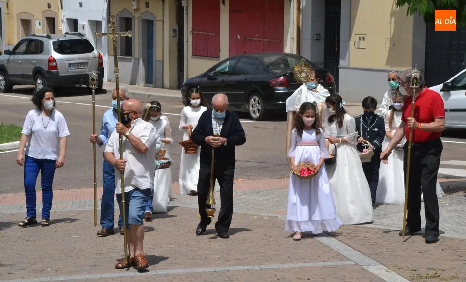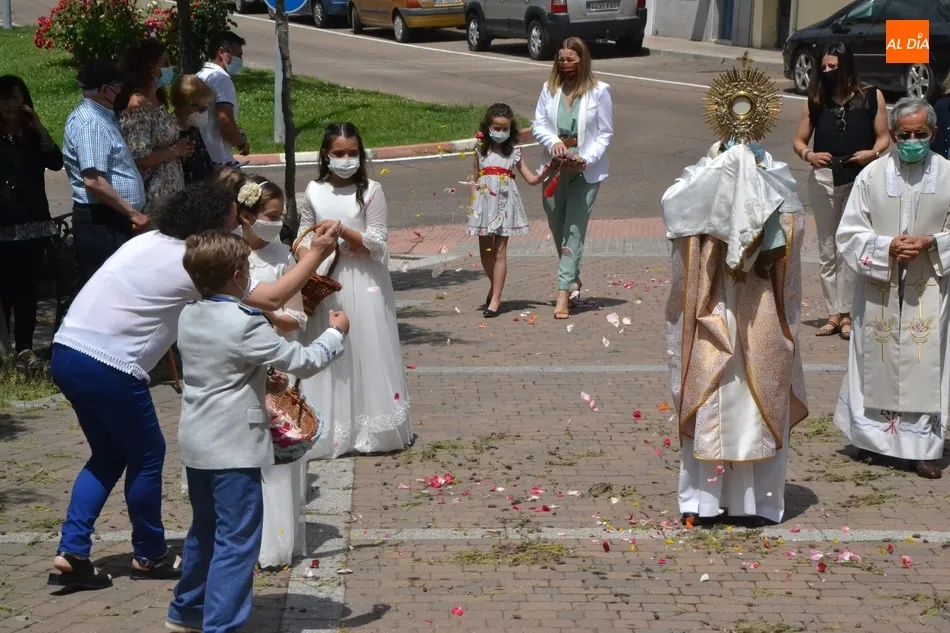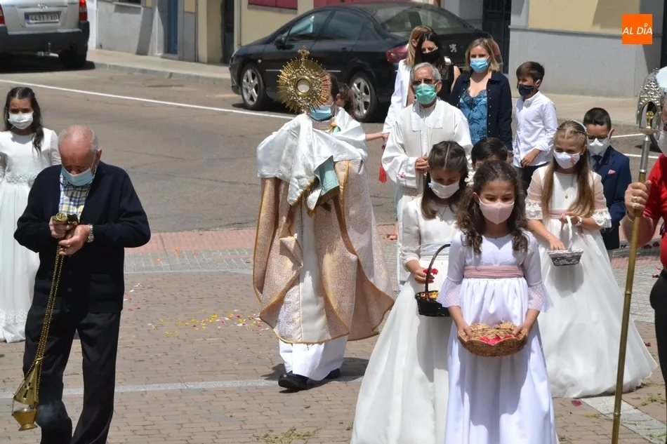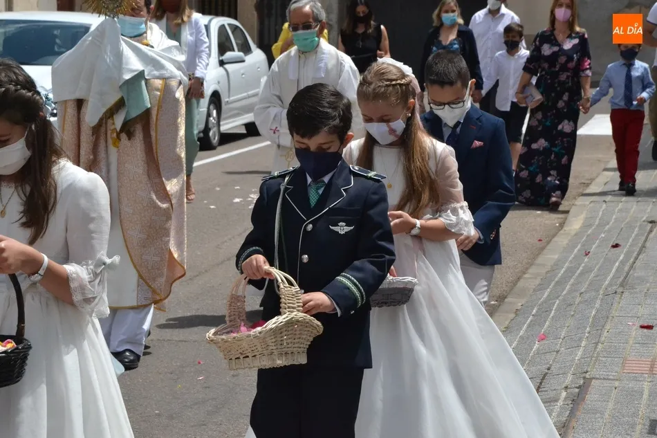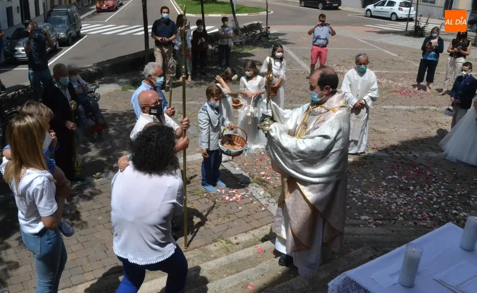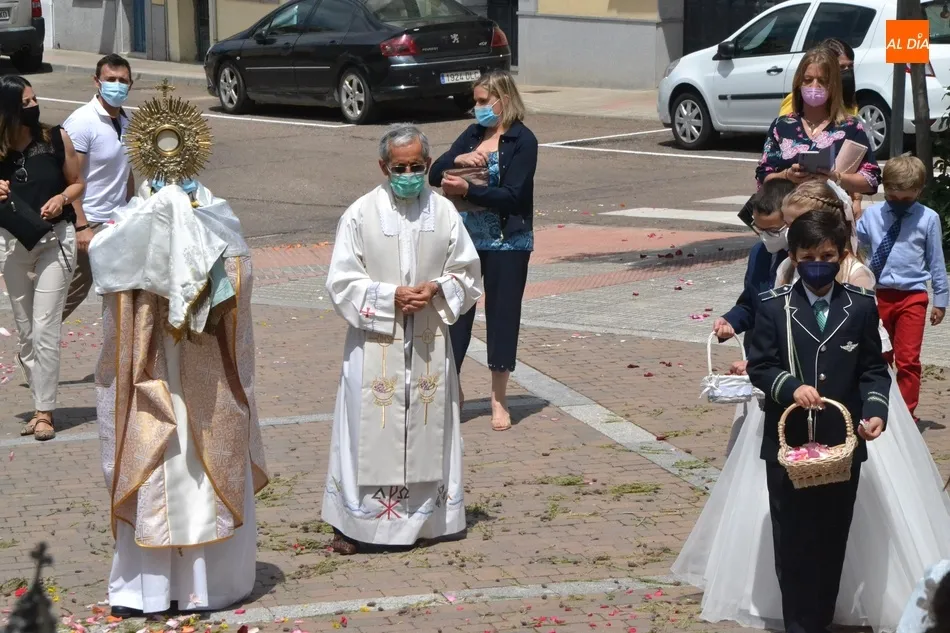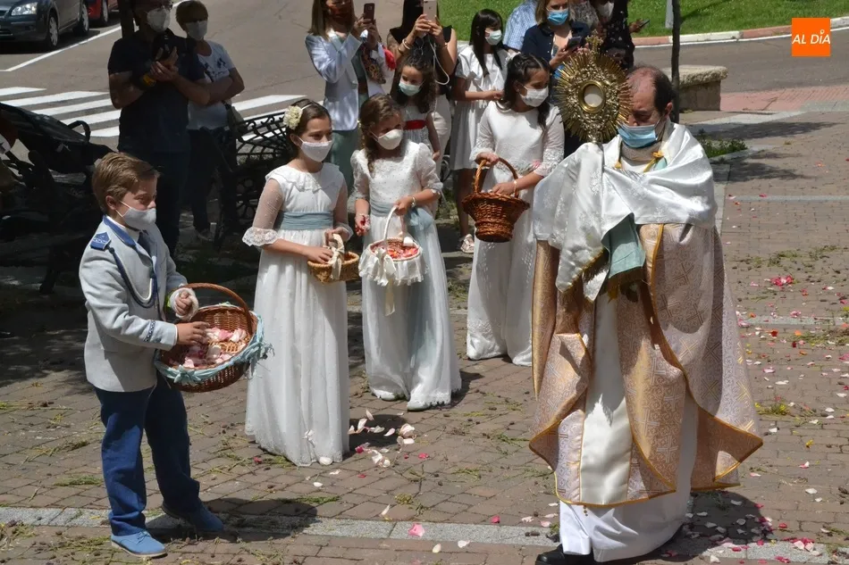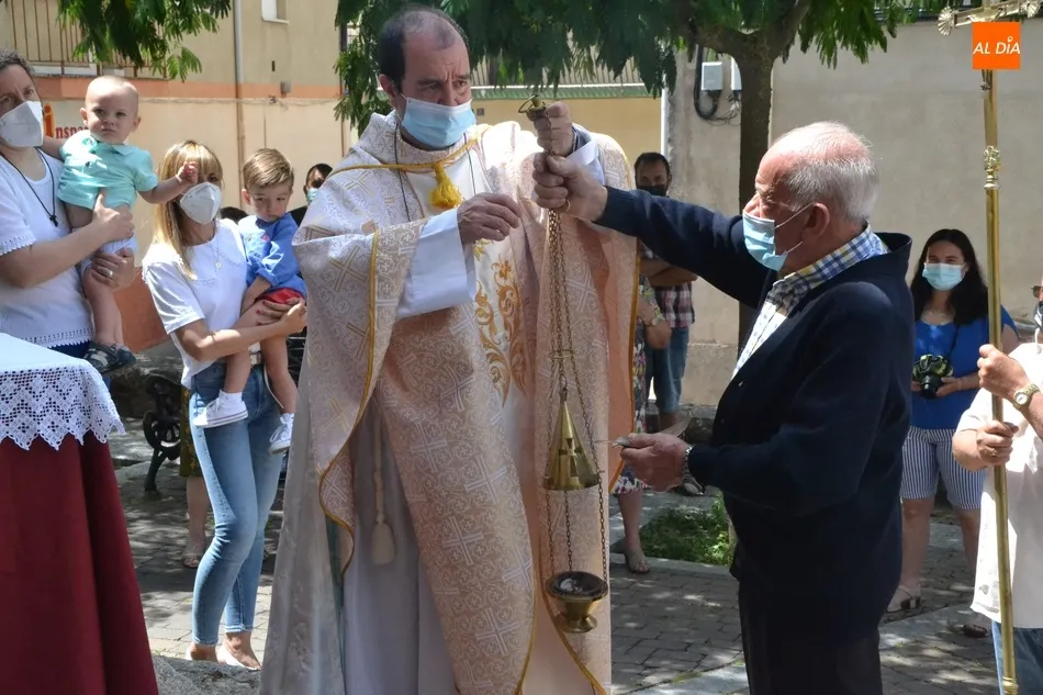 Como marca la tradición en Ciudad Rodrigo, la Parroquia de San Cristóbal celebró en la mañana del domingo la festividad del Corpus Christi una semana después de que tuviera lugar la celebración principal en el centro histórico mirobrigense, que este año se limitó por culpa de la pandemia del coronavirus a una solemne eucaristía en la Catedral de Santa María presidida por el Administrador Apostólico de la Diócesis Civitatense, Jesús García Burillo.
