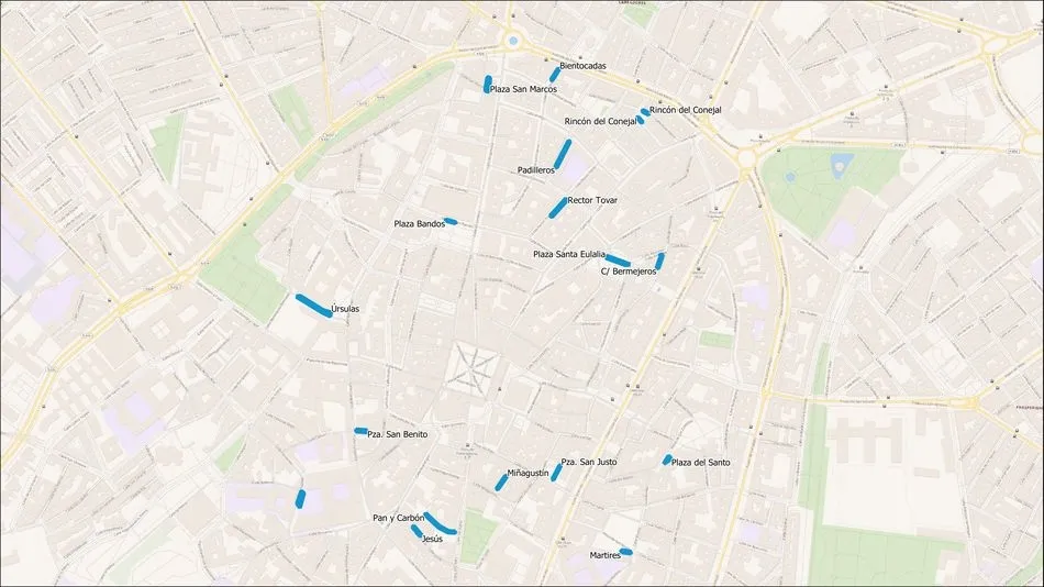 En total se han diseñado 18 islas, que estarán identificadas mediante señalización vertical y que se ubican en el tramo de la calle Bermejeros comprendido entre las calles Aire y Azucena; en las calles Bientocadas, Cervantes, Jesús, de los Mártires, Miñagustín, Padilleros, Pan y Carbón, Rector Tovar, Trinlingüe y de las Úrsulas; así como en las plazas de Los Bandos, San Benito, San Justo, San Marcos, Santa Eulalia, del Santo y Rincón del Conejal.