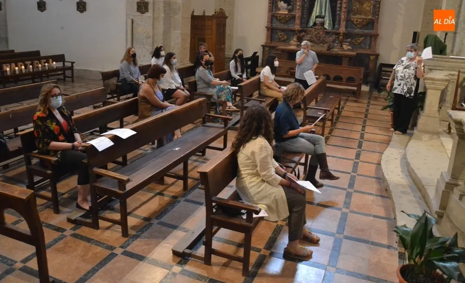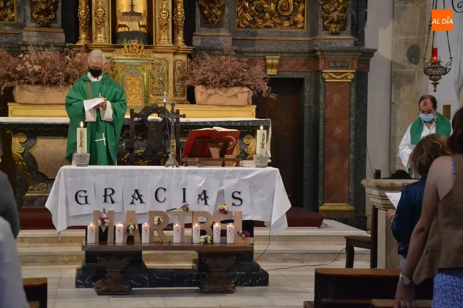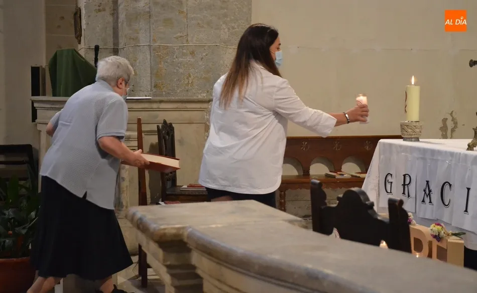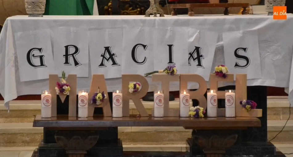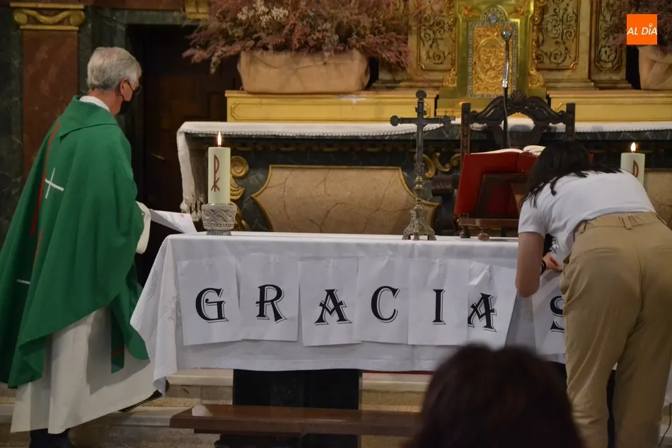 En primer lugar, los miembros de Cáritas se reunieron a última hora de la mañana en las dependencias del Seminario Diocesano, para asistir en su Capilla Mayor a una eucaristía de acción de gracias que fue presidida por Fernando Sánchez Tendero junto a Rafael Caño. Como se puede ver en las imágenes, en el mantel del altar se formó la palabra Gracias con unos folios, y en un banco anexo se colocó a base de letras el nombre de la protagonista, junto a unas velas y unas flores, que fueron acercadas por miembros de la entidad.