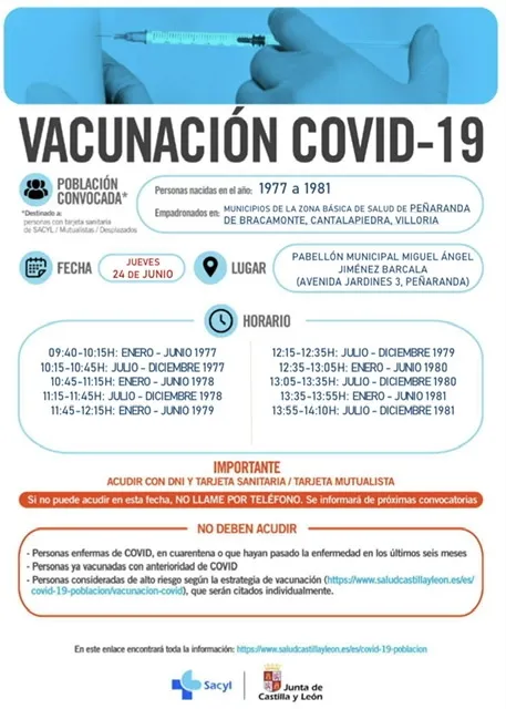 próximo jueves 24 de junio cuando arranque la vacunación destinada a toda la población de las tres zonas sanitarias nacidas de 1977 a 1981. Un dispositivo especial, cuyo comienzo está previsto desde las 09:40 horas de la mañana y que se organiza en horarios una vez más mediante el mes y el año de nacimiento.