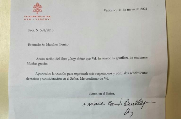 Unos días después de llegar el acuse de recibo procedente la Secretaría de Estado de El Vaticano confirmando la recepción por parte del Papa Francisco del libro ¡Surge Civitas! en defensa de la Diócesis de Ciudad Rodrigo, el presidente del Centro de Estudios Mirobrigenses, José Ignacio Martín Benito, ha recibido también el acuse de recibo de la llegada del libro del Cardenal Marc Oullet, Prefecto de la Congregación para los Obispos, organismo de quién depende el nombramiento de los prelados. Junto al libro, se le envió una carta solicitando el nombramiento de un Obispo titular, exclusivo y residencial para la Diócesis Civitatense. En la carta, además de agradecer el envío del libro, el Cardenal Marc Oullet aprovecha la ocasión para expresarle "mis respetuosos y cordiales sentimientos de estima y consideración en el Señor".