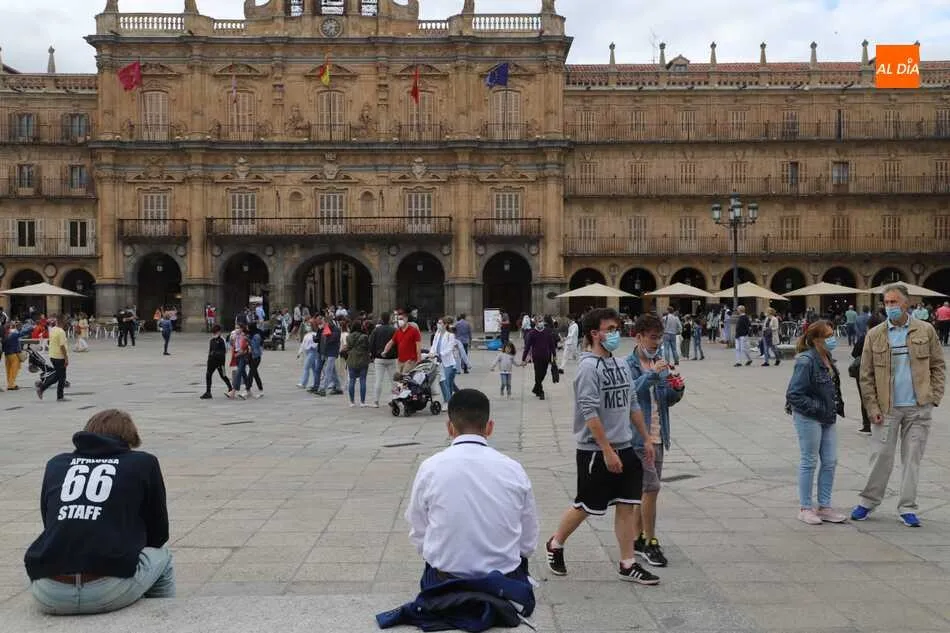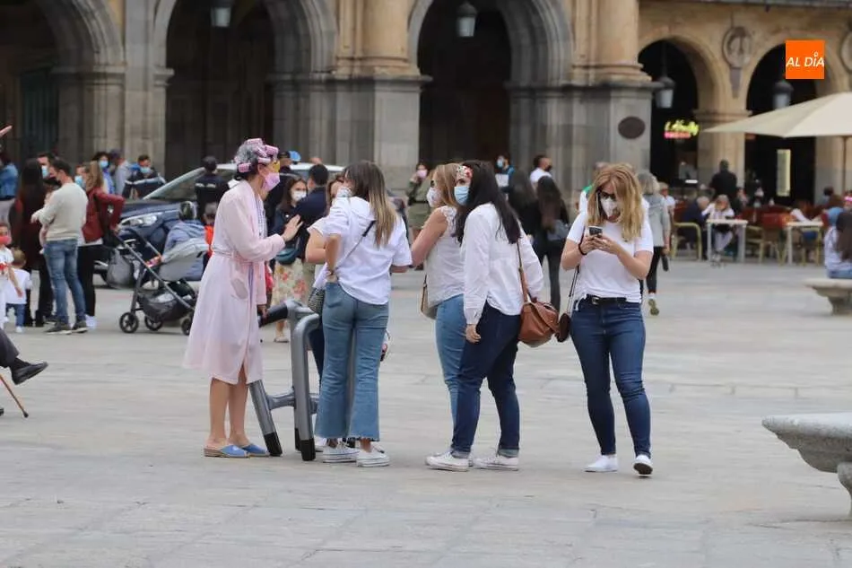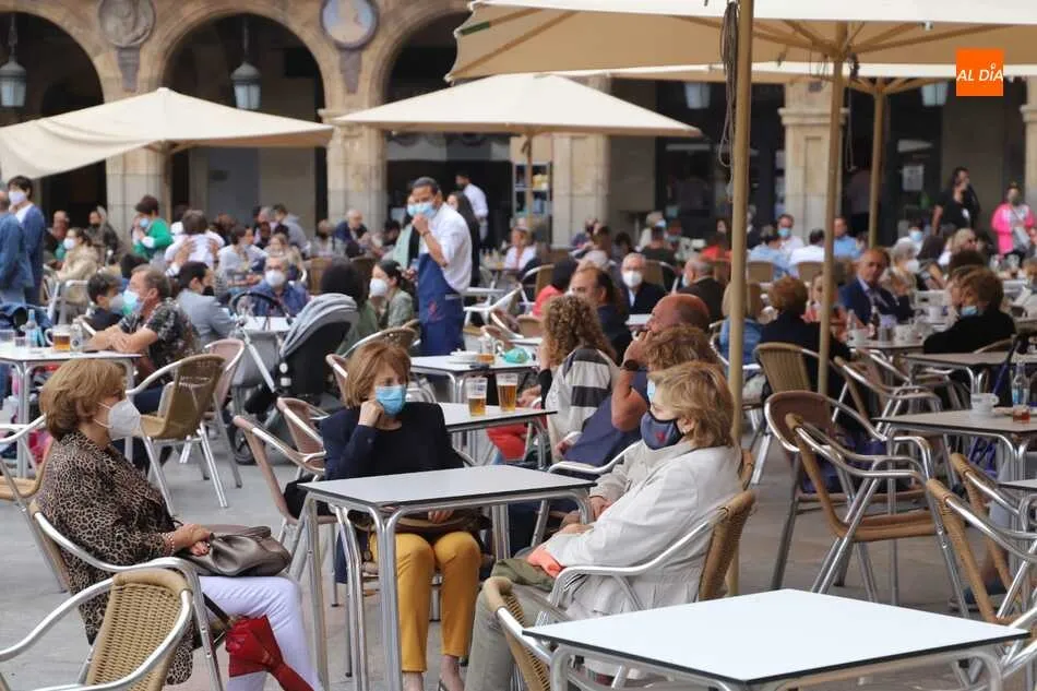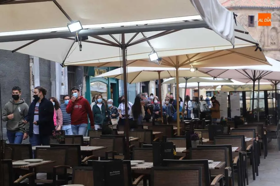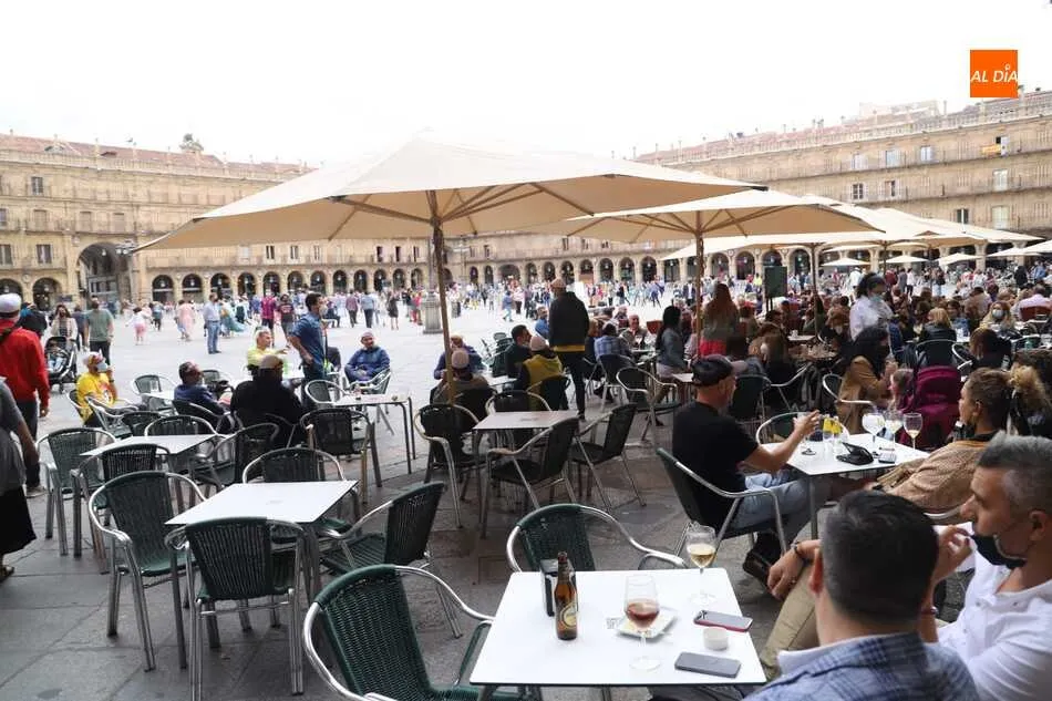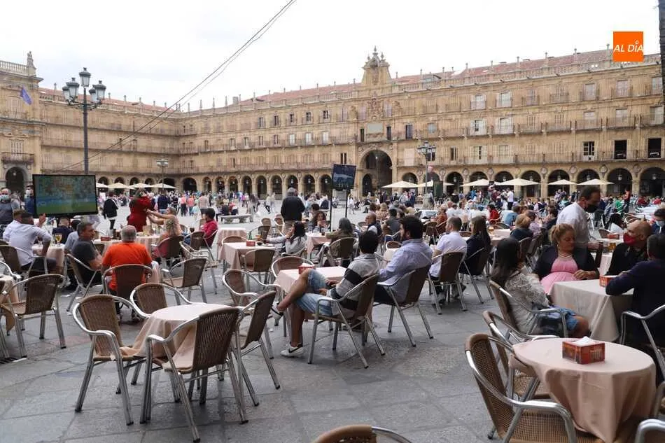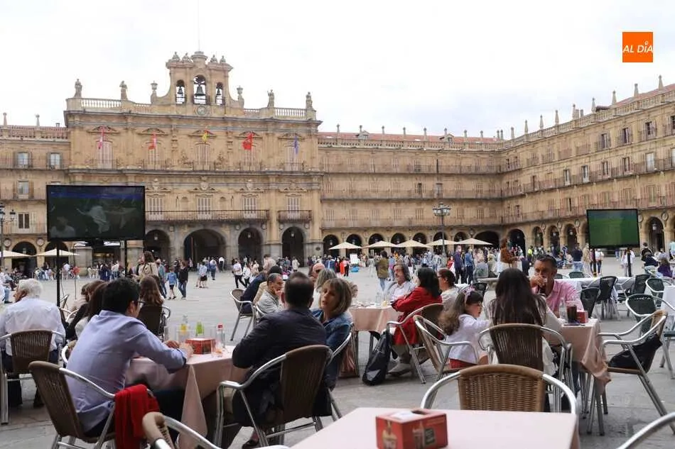 Calles y terrazas llenas en Salamanca durante este sábado, en una jornada en la que la lluvia ha concedido una tregua tras los últimos días de tormentas y precipitaciones intensas, y en la que se han notado las ganas de salir a disfrutar del fin de semana. Coincide que este sábado también había otro motivo para sentarse en una terraza y ver el partido de la selección española de fútbol en la Eurocopa.