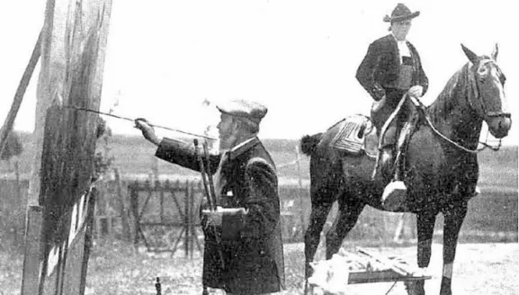 El fotógrafo Venancio Gombau nos muestra en esta escena a Sorolla pintando un cuadro en El Villar de los Álamos, Aldehuela de la Bóveda, con un charro a caballo.