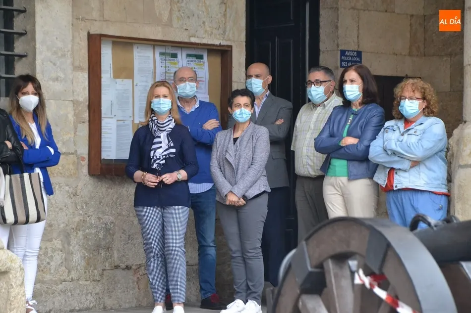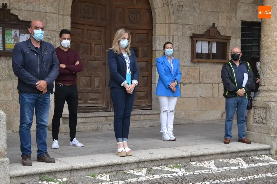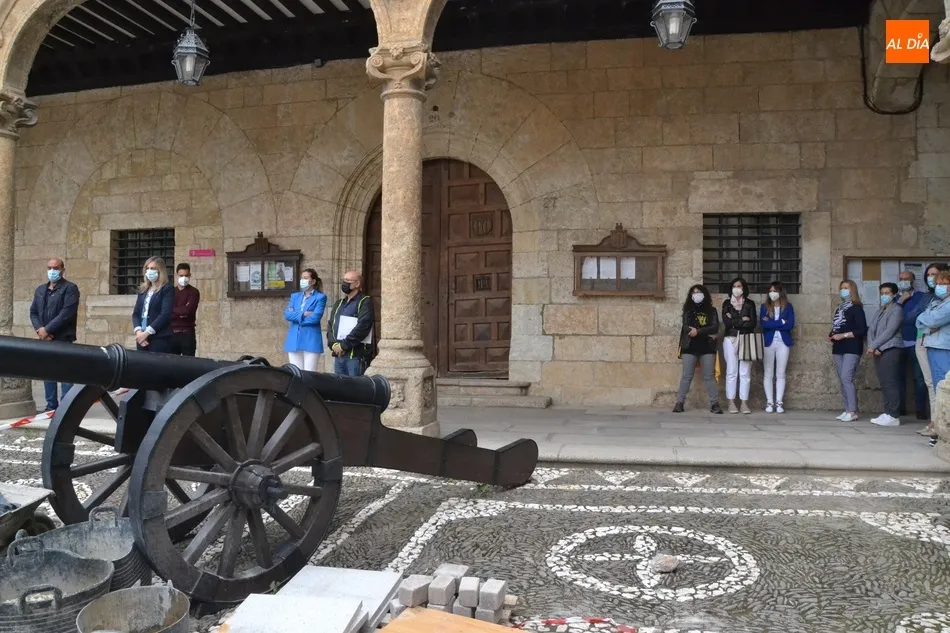 Ciudad Rodrigo se sumó en la mañana del martes al minuto de silencio convocado por la Federación Regional de Municipios y Provincias de Castilla y León (FRMPCYL) a las puertas de los ayuntamientos y diputaciones de toda la región para condenar el asesinato en la jornada del lunes de una mujer de 56 años a manos de su marido en Valladolid. El minuto de silencio en Miróbriga tuvo lugar en los soportales de la Casa Consistorial a las 12 del mediodía, congregándose los concejales Beatriz Jorge Carpio, Ramón Sastre, Laura Vicente, Víctor Gómez y Jorge Labajo, y buena parte de los trabajadores de la Casa Consistorial. El hecho de que estuviesen aparcados a las puertas del Consistorio dos vehículos del Servicio Municipal de Obras (se están rematando las obras de la calle San Juan) hizo que el minuto de silencio quedase bastante ?oculto? para las numerosísimas personas que había en esos momentos transitando por la Plaza Mayor o tomando algo en sus terrazas.
