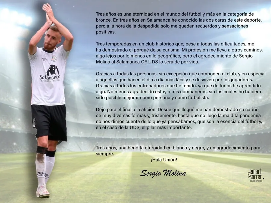 Sergio Molina se despidió del Salamanca UDS tras tres años y puso rumbo al Andorra de Gerard Piqué, club del que es propietario el jugador del FC Barcelona, según adelantó Saldeporte, de la Primera RFEF. De este modo, el centrocampista acabó con su segunda etapa en el club charro a través de una emotiva carta en la que agradeció todo lo vivido en este tiempo, por lo que ahora emprenderá una nueva aventura en su carrera deportiva como profesional.