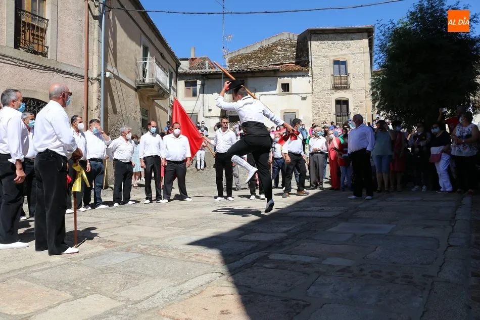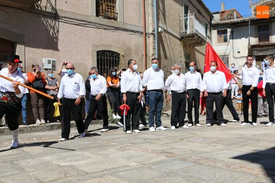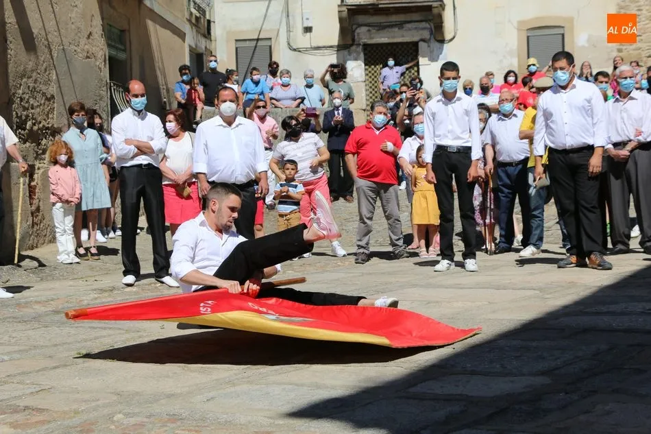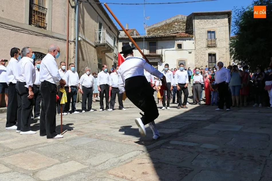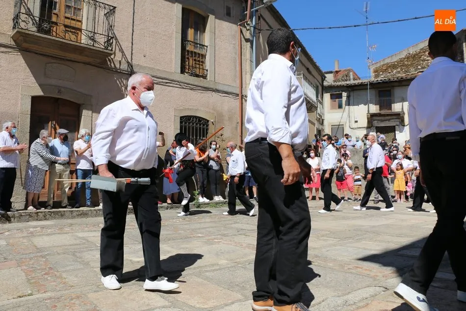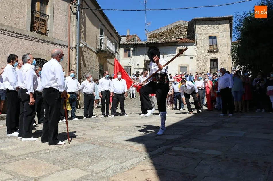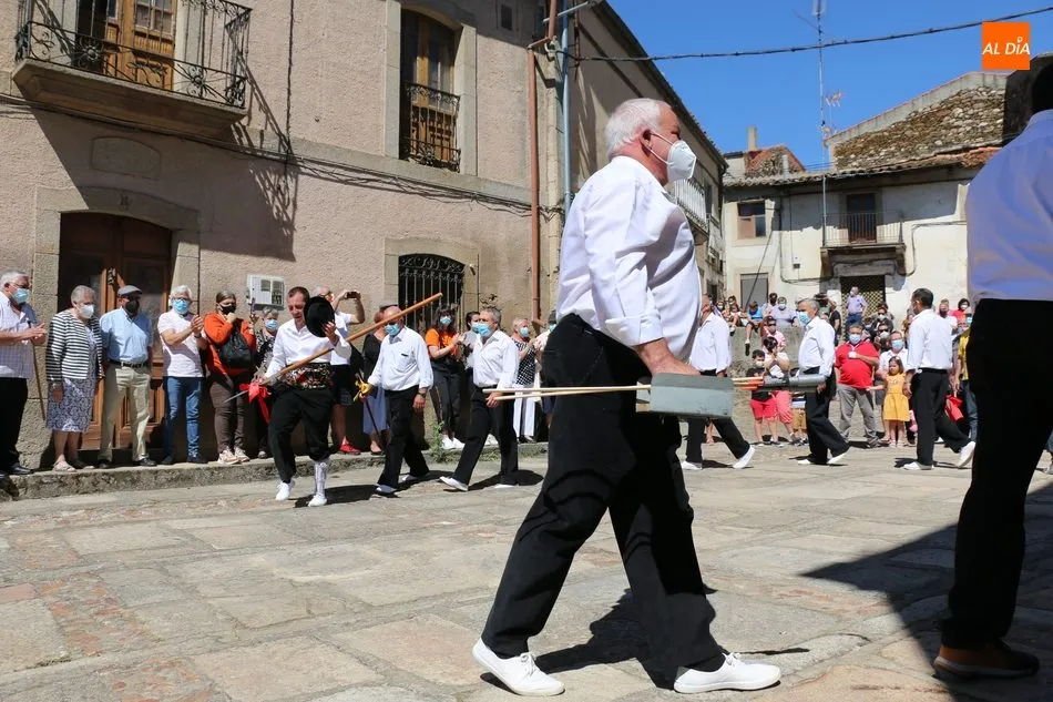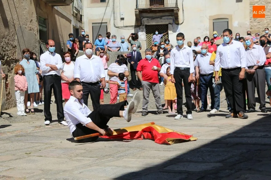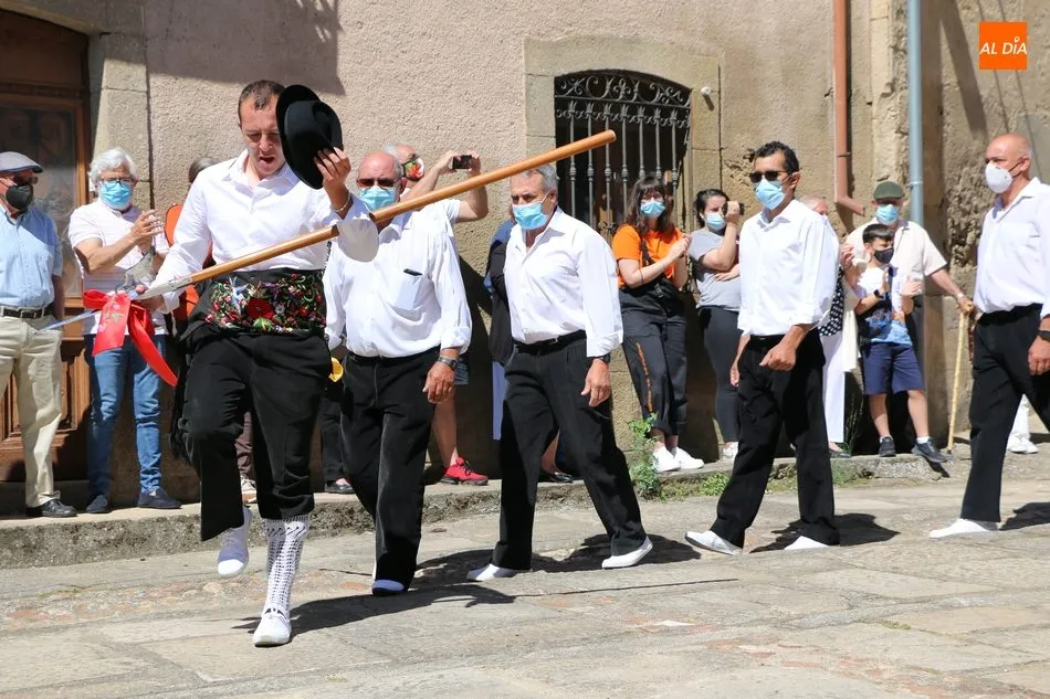 Con José Manuel Bartol a los mandos de la gaita y el tamboril, el público congregado a las puertas del templo, una vez finalizada la misa, vibró con el baile realizado por ambos mozos, interpretando así la leyenda que cuenta la victoria de la villa de Hinojosa sobre el feudal un día del mes de febrero de 1441. De aquel acontecimiento, que enfrentó a los señores de estas tierras contra el obispo de Ciudad Rodrigo, la tradición oral se ha encargado de mitificarlo hasta convertirlo en el mayor símbolo de los hinojoseros: la victoria del pueblo (la bandera) frente el poder del feudal (alabarda), personajes ambos representados en esta tradicional danza que se baila cada 24 de junio.