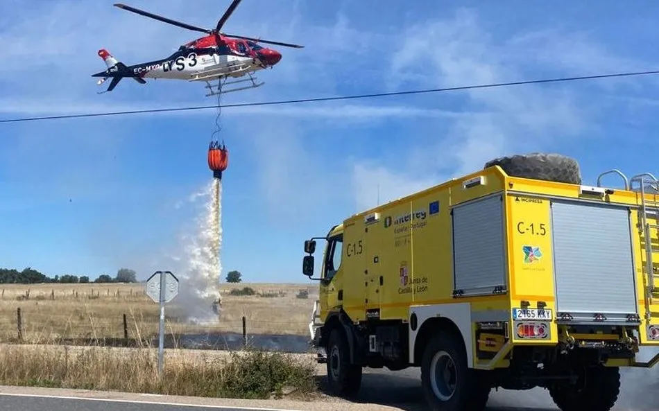 Varias unidades del Parque de Bomberos de Lumbrales, y un helicóptero de Medio Ambiente han participado este viernes en la extinción del incendio de un vehículo y cuyas llamas se extendieron por una de las parcelas próximas al siniestro.