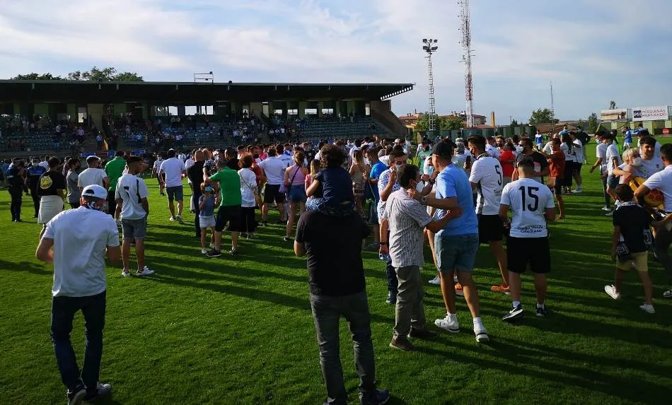 Después de esa falta, apenas se jugaron unos segundos más (en los que vio la roja un jugador local), antes de que llegase el pitido final, que desató la fiesta sobre el césped, sumándose a aficionados y cuerpo técnico del Ciudad Rodrigo CF la impresionante marea farinata que se había desplazado hasta Segovia, tanto en autobús como en coches particulares.