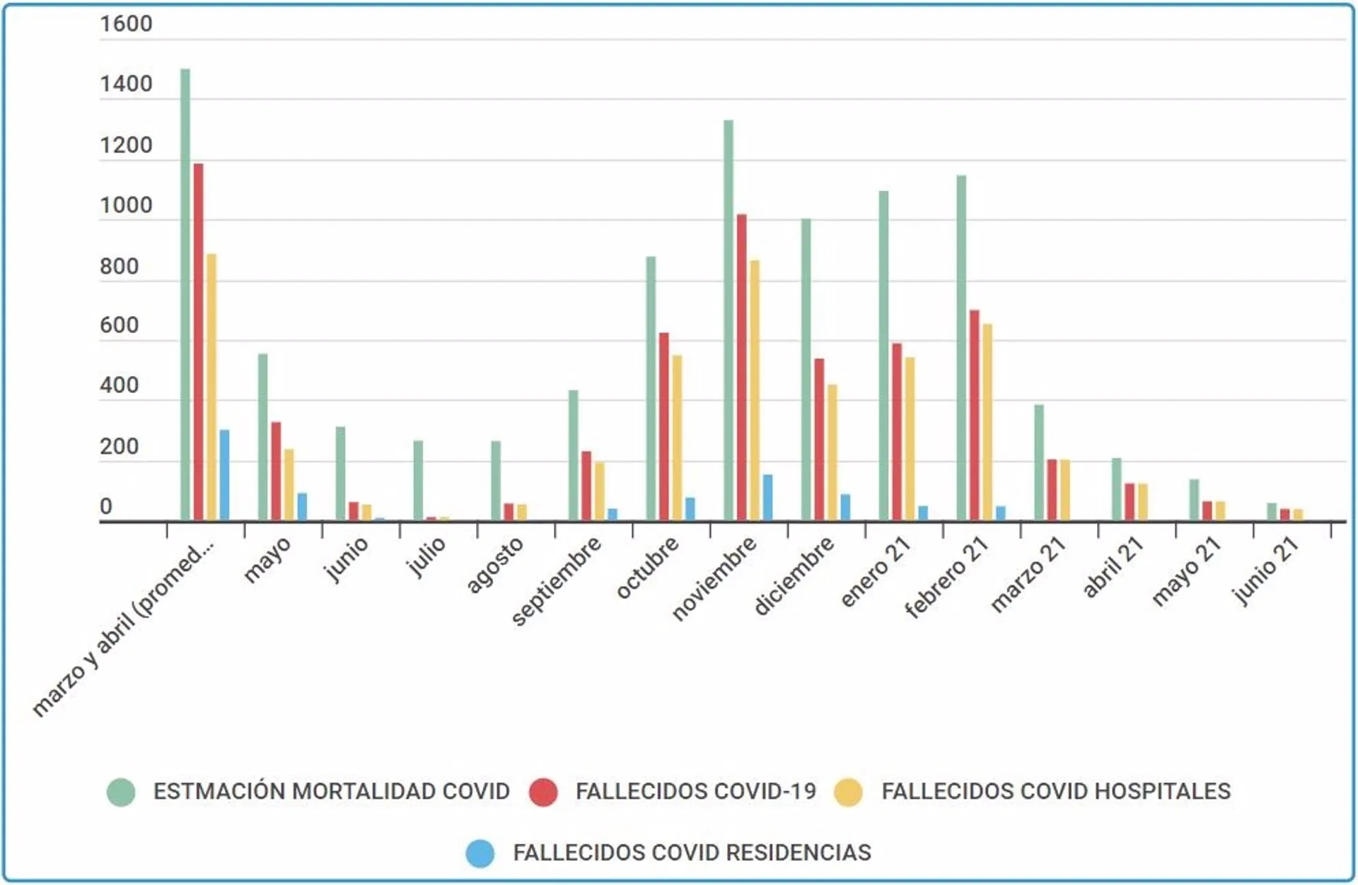 El mes de junio de 2021, el décimosexto de la pandemia del coronavirus, ha mantenido la tendencia a la baja de los efectos del COVID-19 ya que ha concluido con 37 fallecimientos de personas con la enfermedad, 26 menos que en mayo, y además ha sido el primer mes sin muertes de personas residentes en centros asistenciales a causa de la enfermedad desde marzo de 2020.
