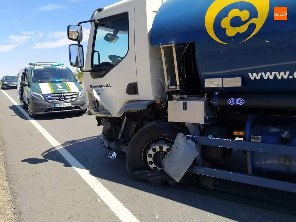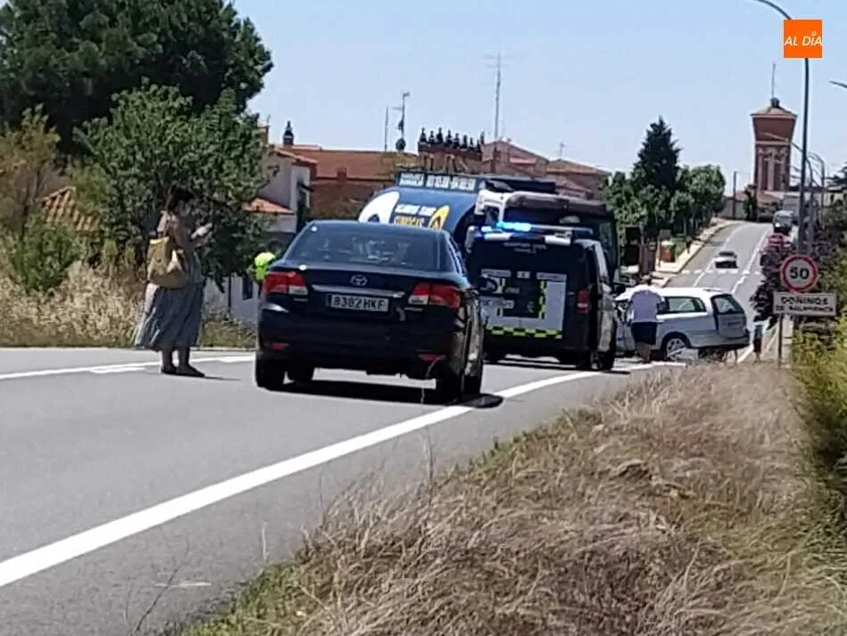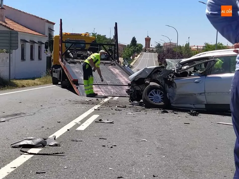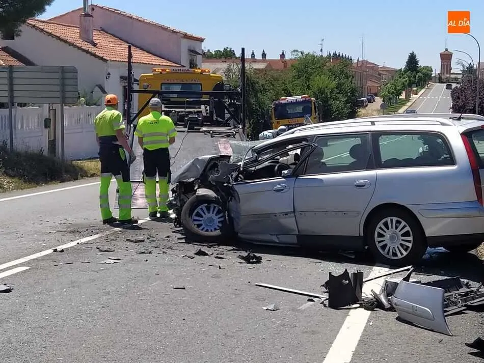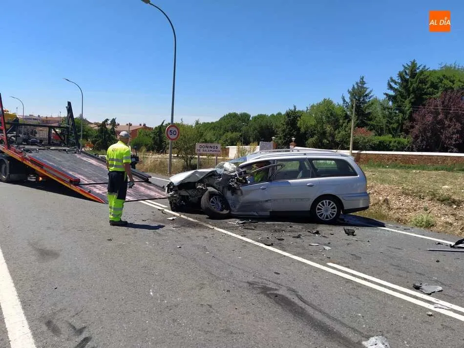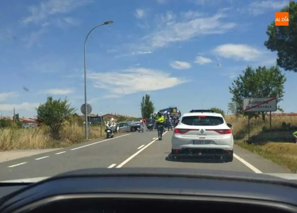 Aparatoso accidente de tráfico el que ha tenido lugar en torno a las 15 horas de este viernes en en el kilómetro 2 de la carretera CL-517 en Doñinos de Salamanca tras la colisión de dos vehículos y un camión que transportaba gasóil. El accidente se ha producido después de que uno de los turismos hubiera invadido el carril contrario tras un despiste de la conductora, vecina del municipio, impactando contra el camión que circulaba en sentido contrario. En el choque también se ha visto implicado un tercer vehículo.