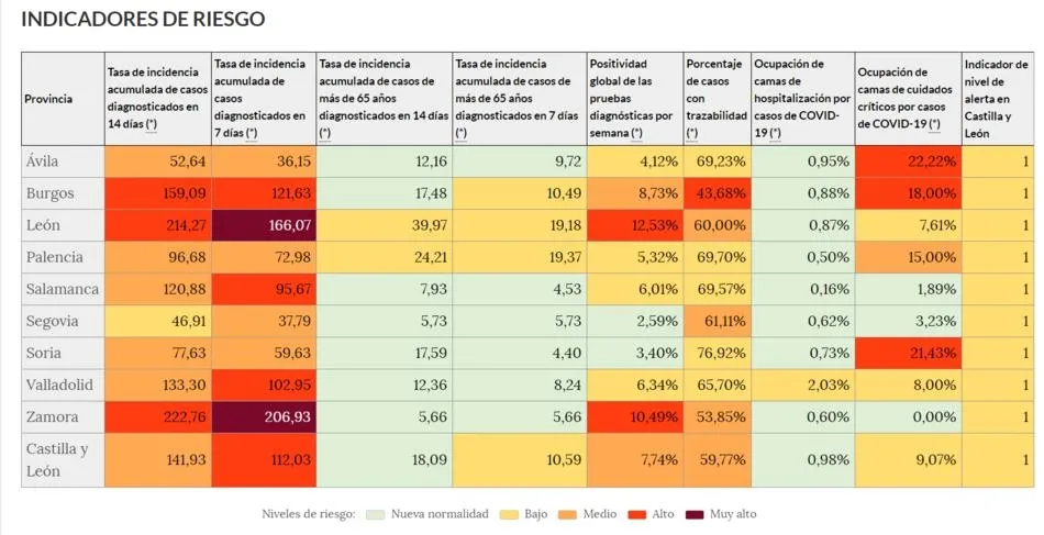 La incidencia sigue disparada en la provincia de Salamanca, con tres jornadas consecutivas con incrementos por encima de los veinte puntos, tanto en la incidencia acumulada a 14 días como a 7 días. Esta última además se sitúa ya en riesgo ?alto?, tras alcanzar los 95 casos por cada cien mil habitantes (lo que se traduce en 25 puntos que el día anterior). Por su parte, la incidencia acumulada a 14 días se sitúa 120 casos (con un incremento de 26 puntos en la última jornada).