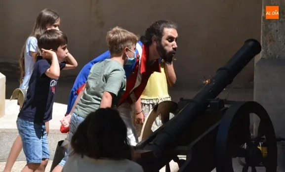 La jornada de viernes de la Semana Napoleónica-Homenaje a Herrasti comenzó con la segunda de las propuestas programadas para que los más pequeños también se sumerjan en el ambiente de estos días. Después de que en las tardes del lunes y el martes la isla de El Picón acogiera sendas tandas de actividades con manualidades y juegos, en la mañana del viernes tuvo lugar la representación de la pieza de microteatro ¡No me deis más guerra! en uno de los patios del Palacio de Los Águila. Esta obra está protagonizada por Sergio Cardoso, quién se mete en la piel de un soldado francés, que va interactuando de forma divertida con los niños asistentes. El estreno de esta pieza ¡No me deis más guerra! contó con una treintena de espectadores (el aforo está limitado) entre niños y sus familias, estando previsto que se represente todos los viernes de verano a las 13.00 horas.
