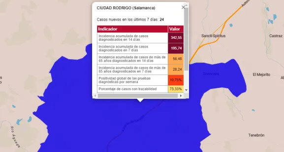 Aunque la cifra concreta de incremento no se puede precisar ya que el domingo pasado no se ofrecieron datos (y por ende no se puede comparar), Ciudad Rodrigo ha sumado en las últimas horas al menos 4 positivos, ya que la incidencia semanal ha crecido respecto al sábado de 163 a los mencionados 195 casos por cada 100.000 habitantes (en números absolutos, se pasa de 20 a 24 positivos en los 7 días previos). Asimismo, continúa creciendo la incidencia quincenal, que también marca cifras que no se veían desde febrero, con 342 casos por cada 100.000 habitantes.