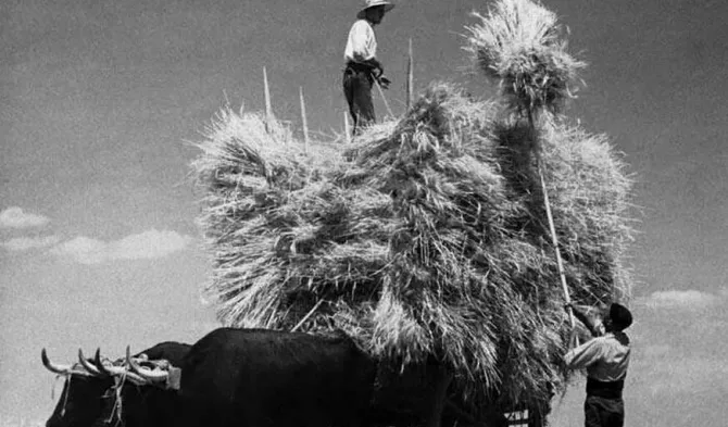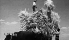 Labores del campo en Herguijuela de Ciudad Rodrigo. En una de ellas se puede ver como las mujeres detrás de los segadores van atando los haces.