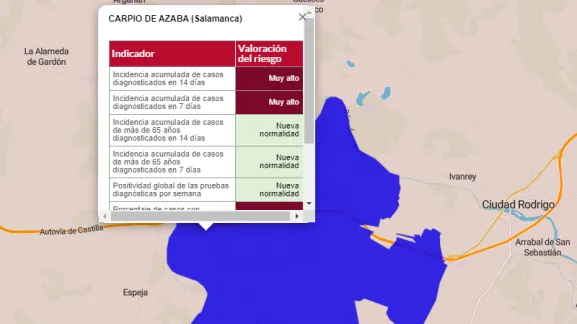 En lo que respecta a Carpio de Azaba, se sabe que hay al menos un nuevo positivo ya que el nivel de riesgo de su dato de incidencia acumulada semanal vuelve a ser ?Muy Alto?, después de que únicamente en la jornada del domingo estuviese en ?Nueva Normalidad? al cumplir la semana de antigüedad el anterior positivo que se había registrado en esta localidad.