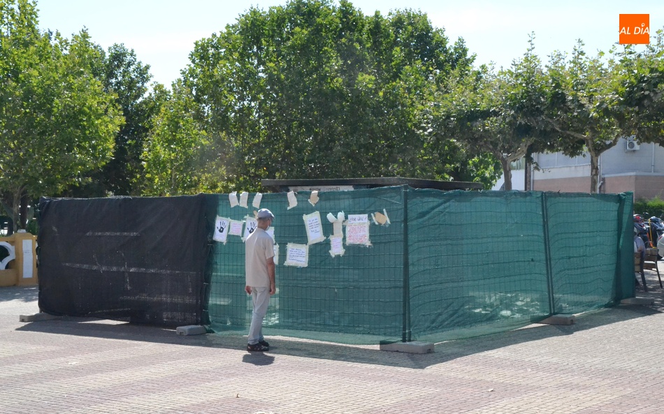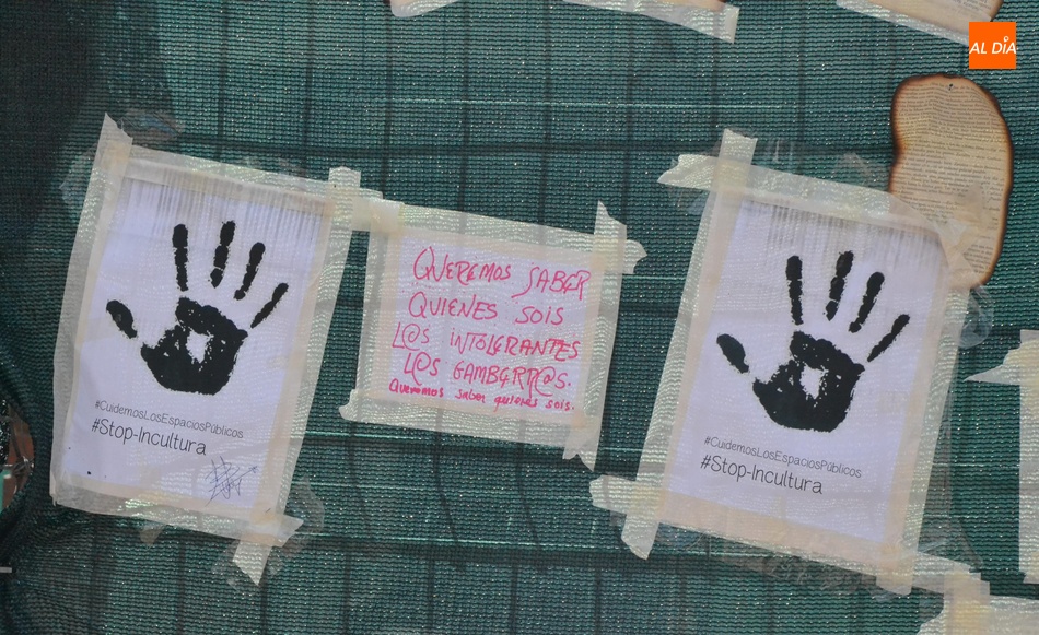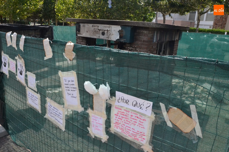 La Bibliocaseta ha sido rodeada por vallas, en las cuales se han colocado varios textos reivindicativos