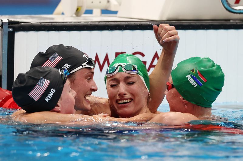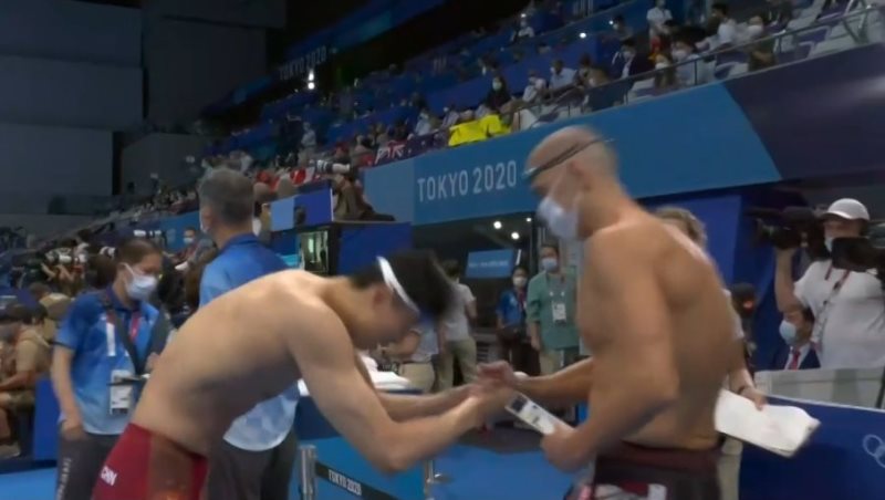 11) Bonitas imágenes en la piscina, con la reunión de oro, plata y bronce en el agua tras el récord mundial de Schoenmaker; y la reverencia del oro en 200 estilos, Shun Wang, al mítico húngaro Laszlo Cseh (ya tuvo medalla en Atenas'2004).