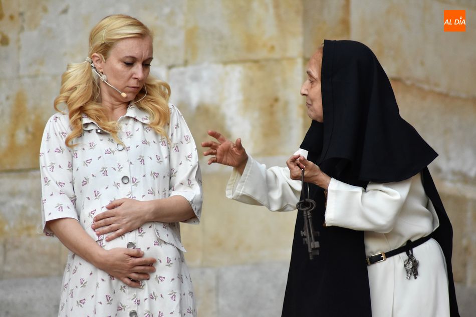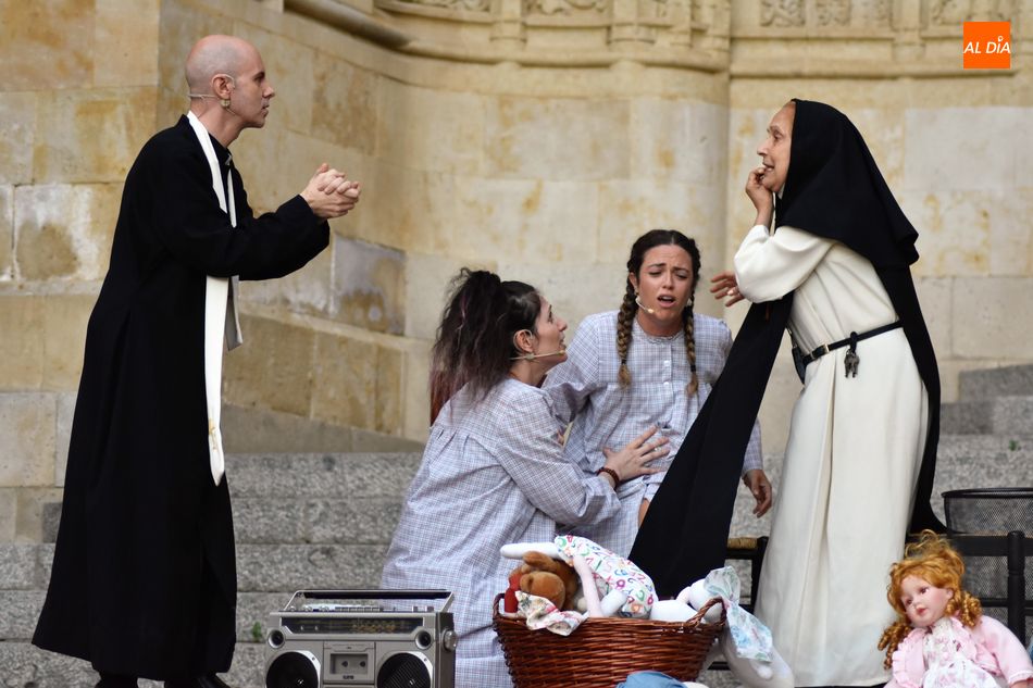 Una historia dolorosa que, en el trabajo de Komo Teatro, tiene la gracia y el humor de sus puestas en escena, fantástica mezcla siempre de la música, la canción, la comicidad de texto y actuación y la absoluta tragedia. Un contrapunto que saben trabajar fantásticamente en todos sus trabajos y que en este caso es aún más notable: las chicas juegan con muñecas, cosen, se divierten, hacen todo tipo de travesuras propias de su condición casi infantil, y al mismo tiempo, se enfrentan a la desgracia e incluso, a la ruptura dramática con su desolador destino. Frente a ellas, fantásticas las actrices, un coro lleno de gracia, la iglesia muestra su rostro benevolente ?el personaje interpretado por Amalia de Prado-, su futura visión más moderna en el caso del cura joven que tan fantásticamente recrea Bernardo Barrios y su más terrible representación, la del Monseñor de Félix Nieto capaz de todos los vicios que es un auténtico placer para el público frente a la puerta de madera y remaches centenarios de la puerta de la catedral.