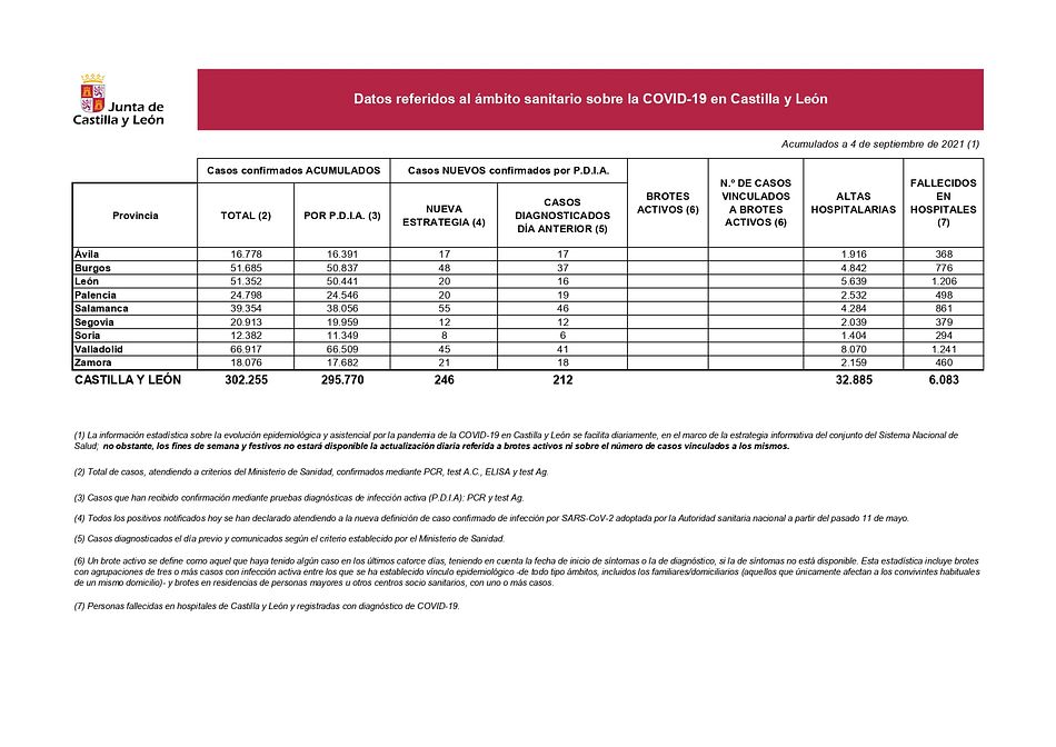La situación sanitaria, recogida territorialmente, puede consultarse en el archivo adjunto de forma más amplia a través de este enlace al Portal de Transparencia de la Administración castellana y leonesa ( Enlace a la información estadística sanitaria diaria sobre la pandemia por la COVID-19 en Castilla y León ); también ahí puede encontrarse la evolución diaria de la vacunación frente a la COVID-19.