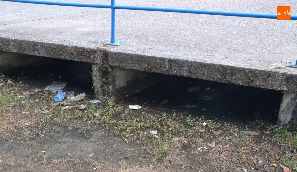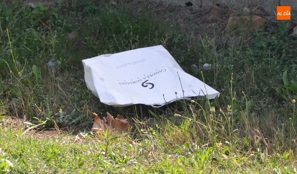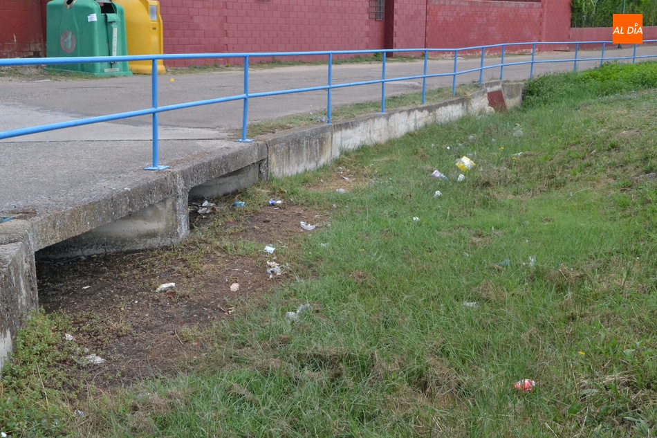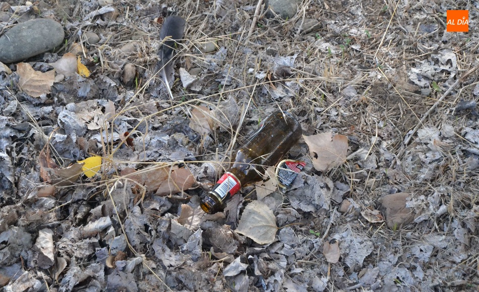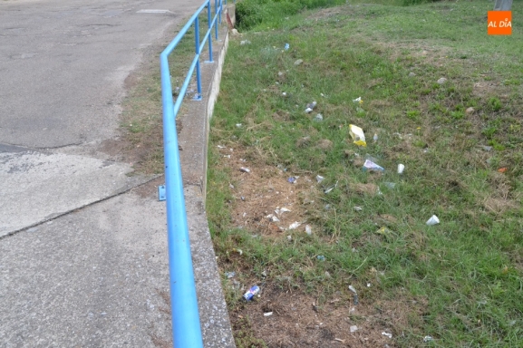 Esa imagen se repite desde ese punto en dirección al Colegio El Puente, pudiéndose ver en la cuneta botellines de cerveza vacíos, envoltorios de helados, botellas vacías de plástico e incluso la bolsa de una zapatería. Mientras, en la otra dirección, hacia la calleja que lleva al río, se pueden ver también múltiples latas y botellas (algunas de ellas parece que 'con solera'), e incluso una garrafa de agua vacía enredada en lo verde.