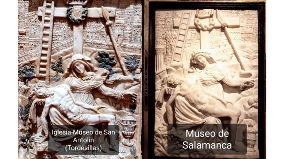 ¿Qué puede unir a Tordesillas con Salamanca? ¿Qué tienen en común la Iglesia-museo de San Antolín con el Museo de Salamanca, si están separados por más de 90 km? Pues una pequeña Piedad de alabastro. Antes de visitar el museo salmantino, estuve en Tordesillas y le puse especial atención a dicha pieza. Me llamó la atención su tamaño y que estuviera ubicada dentro de un retablo portátil, devocional, de trazo herreriano. La delicadeza de los pliegues, la marcada anatomía del cristo yaciendo en los brazos de María, el dolor calmado de ella, los detalles secundarios ?calavera (haciendo referencia al Calvario: monte de la calavera), tarro de perfume (ausencia de la Magdalena, remite al posterior entierro de cristo), restos de policromía? Alabado sea el alabastro. Otro día fui al Museo de Salamanca y, para mi sorpresa, encontré una obra que ya había visto antes. Ese sentimiento no era un déjà vu, aunque era algo muy parecido. Fue una sensación de aprendizaje, de satisfacción, de disfrutar de nuevo del arte. "Esa obra la he visto antes en Tordesillas". Al llegar a casa, comparé las fotos hechas a ambas imágenes y, efectivamente, el parecido era innegable. No son gemelas idénticas, pero sí son hermanas mellizas. La pieza salmantina es completamente blanca, casi marfil, tiene menos vegetación y desaparece la calavera (sustituida por un matorral).