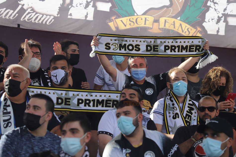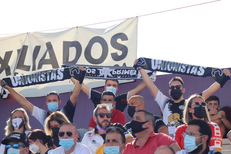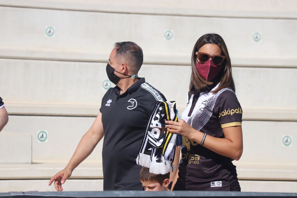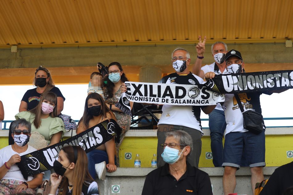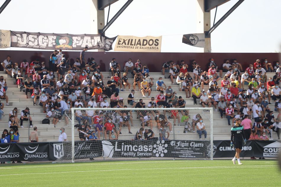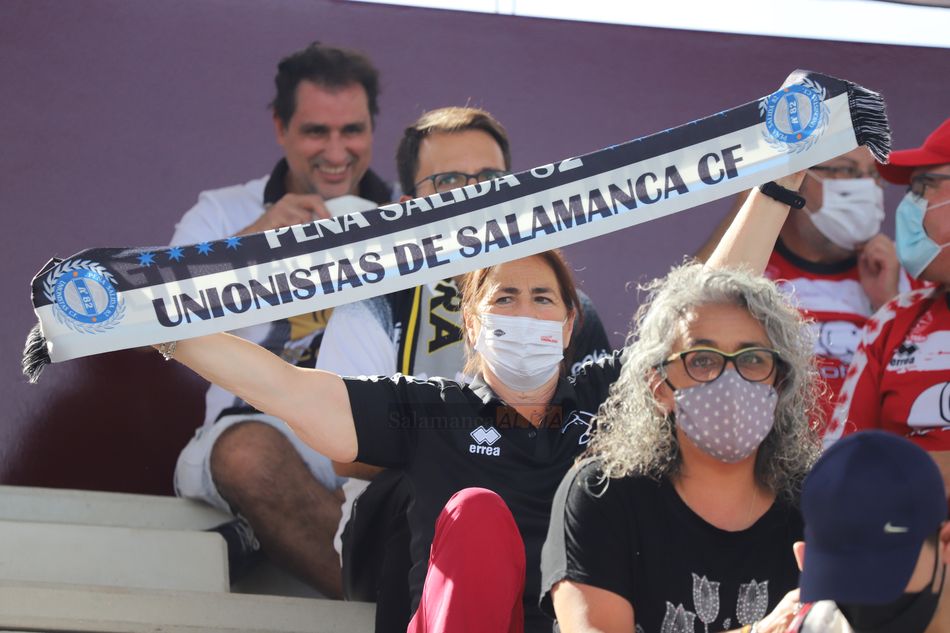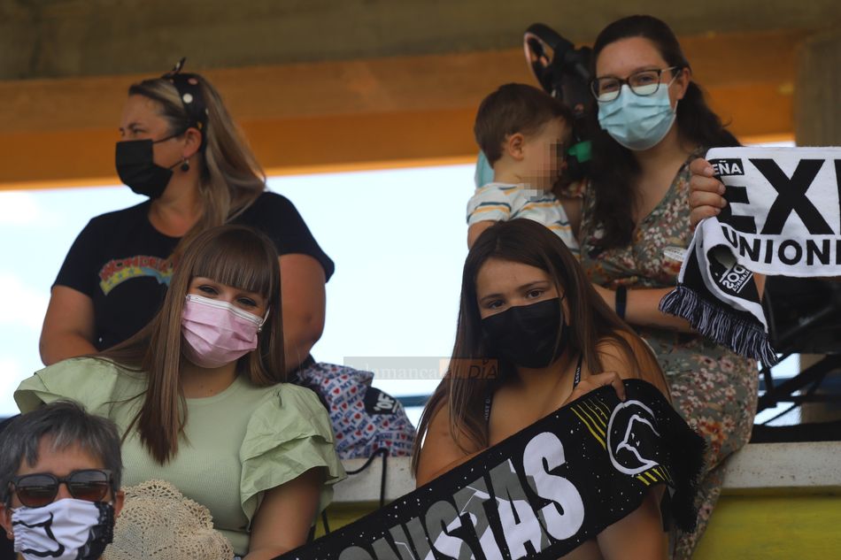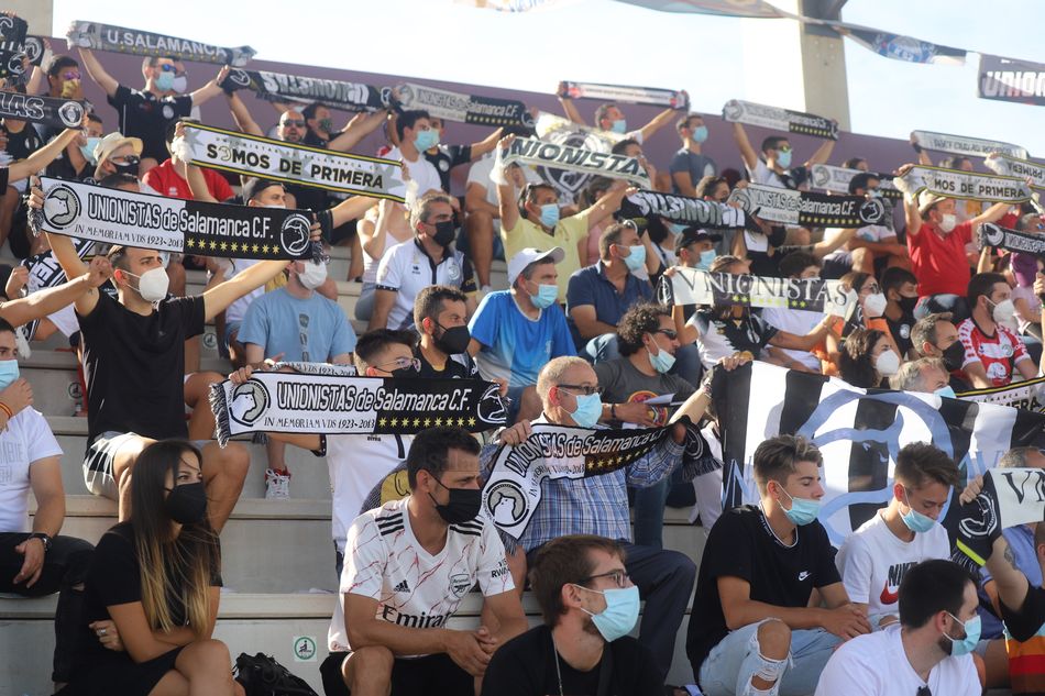 La grada de animación de Unionistas ya se dejó sentir en el estadio, puesto que se ubicó en el Fondo Oeste del Reina Sofía y lució un gran aspecto en el duelo con el Extremadura, aunque las restricciones sanitarias existentes por la pandemia del coronavirus aún no dejaron verla en todo su esplendor.
