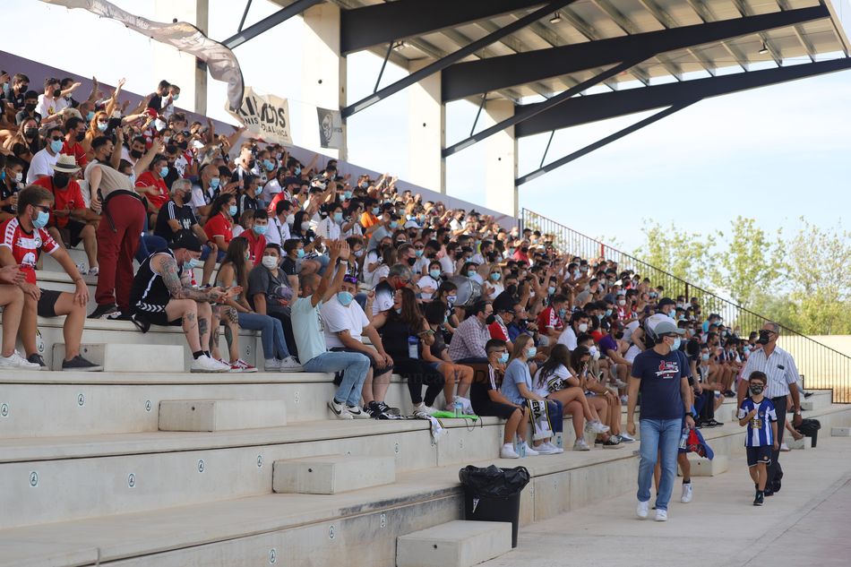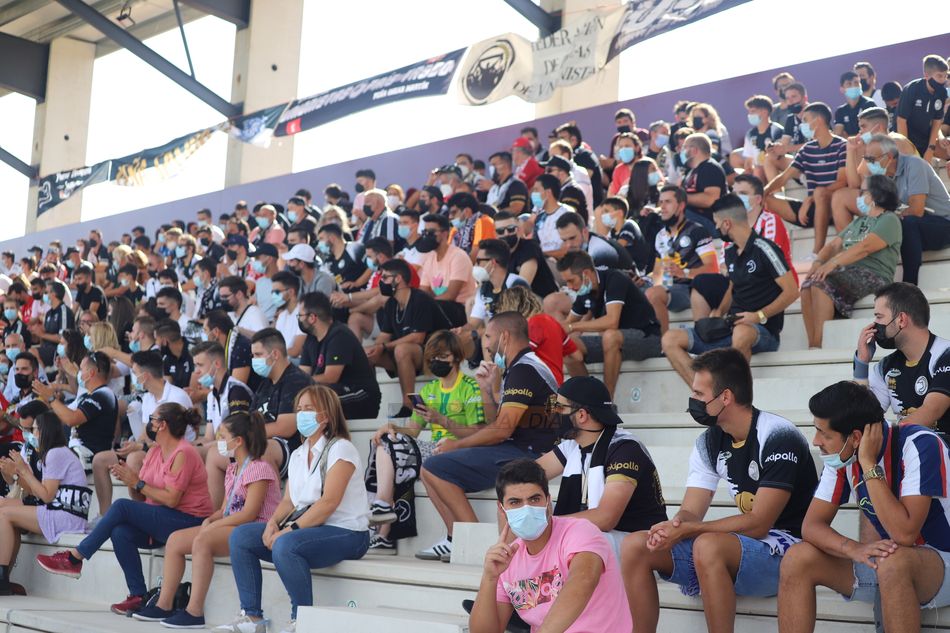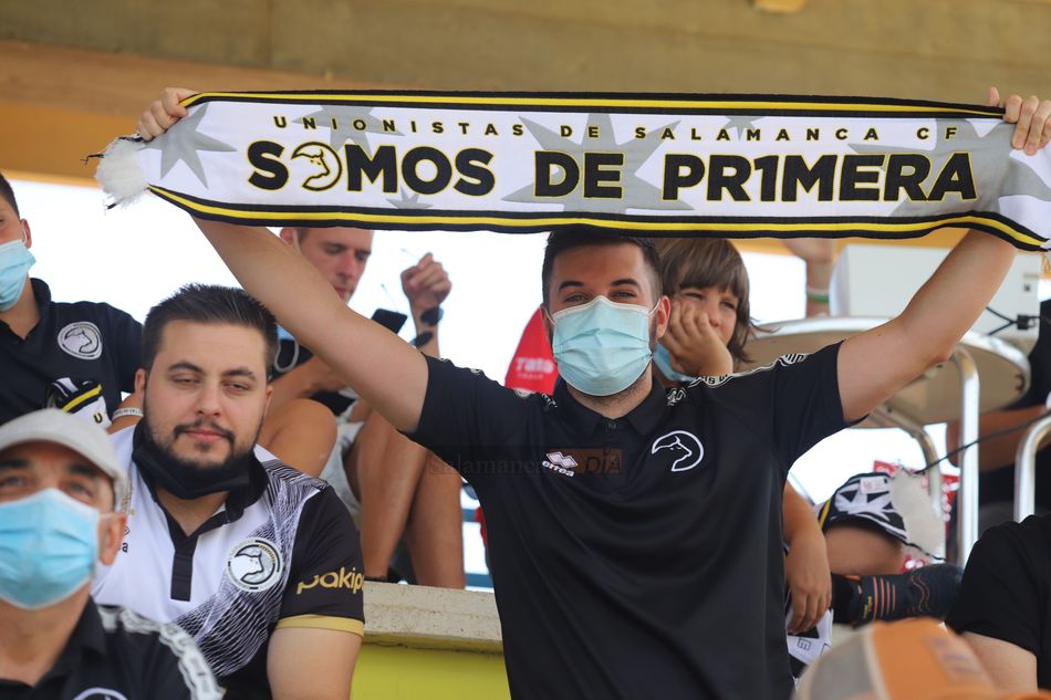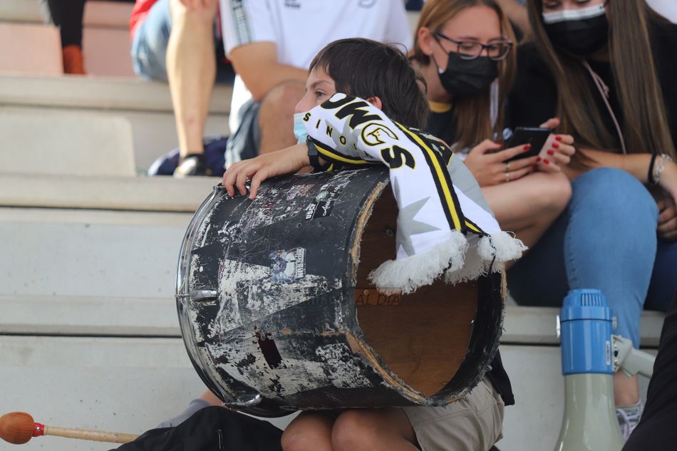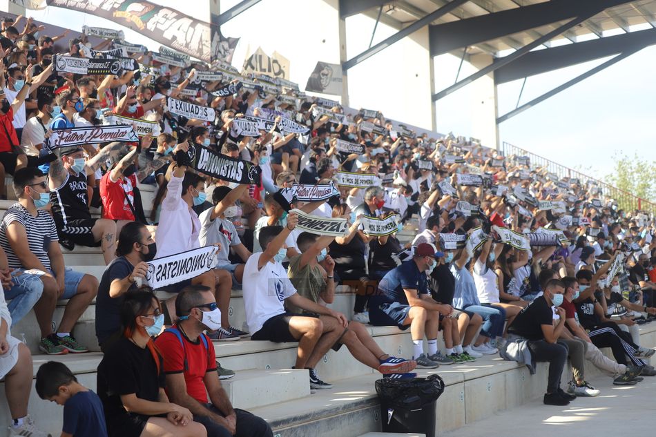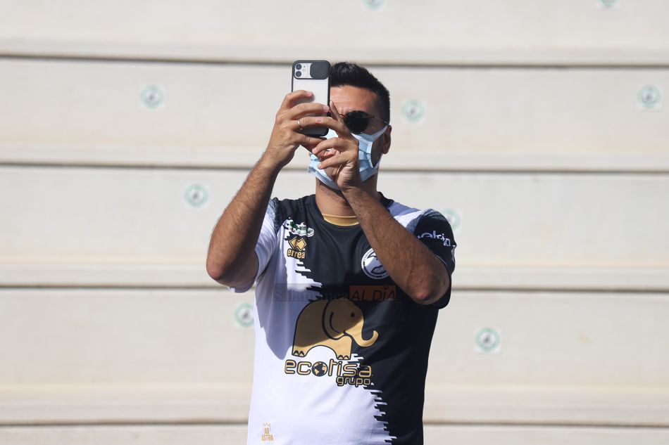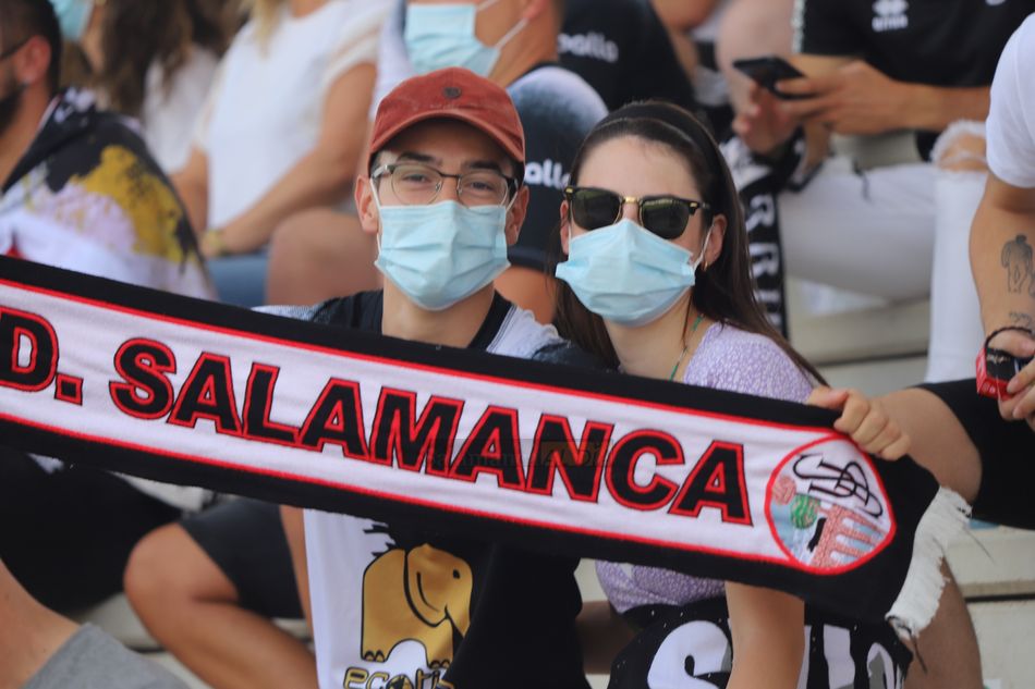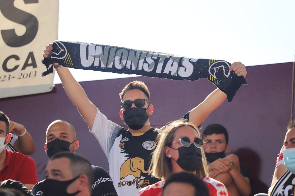 La grada de animación de Unionistas ya se dejó sentir en el estadio, puesto que se ubicó en el Fondo Oeste del Reina Sofía y lució un gran aspecto en el duelo con el Extremadura, aunque las restricciones sanitarias existentes por la pandemia del coronavirus aún no dejaron verla en todo su esplendor.