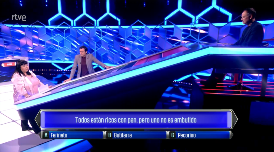 Posteriormente, en la ronda en la que se enfrentó al 'Cazador', que en este caso era un 'viejo conocido' para los mirobrigenses, Erundino (compañero de José Pinto en los emblemáticos Lobos de ¡Boom!), le plantearon a la concursante el siguiente enunciado: 'Todos están ricos con pan, pero uno no es embutido', proponiéndole como posibles respuestas farinato, butifarra y pecorino. Tanto la concursante como Erundino dieron con la respuesta correcta al enunciado, señalando que no es un embutido el pecorino.