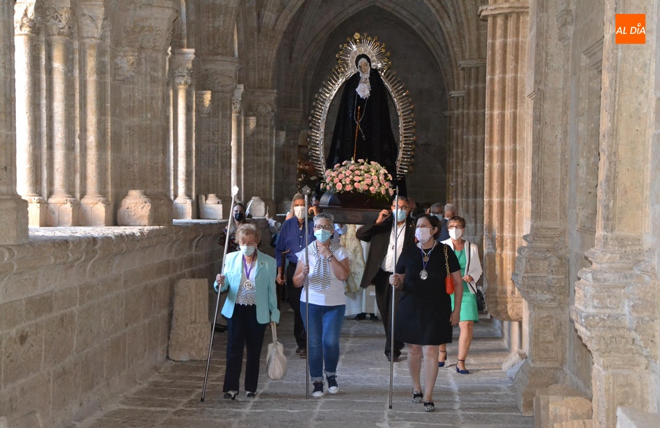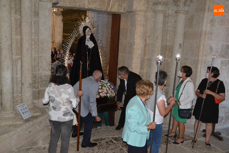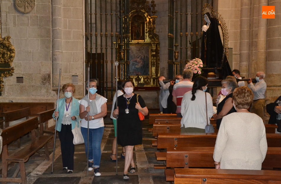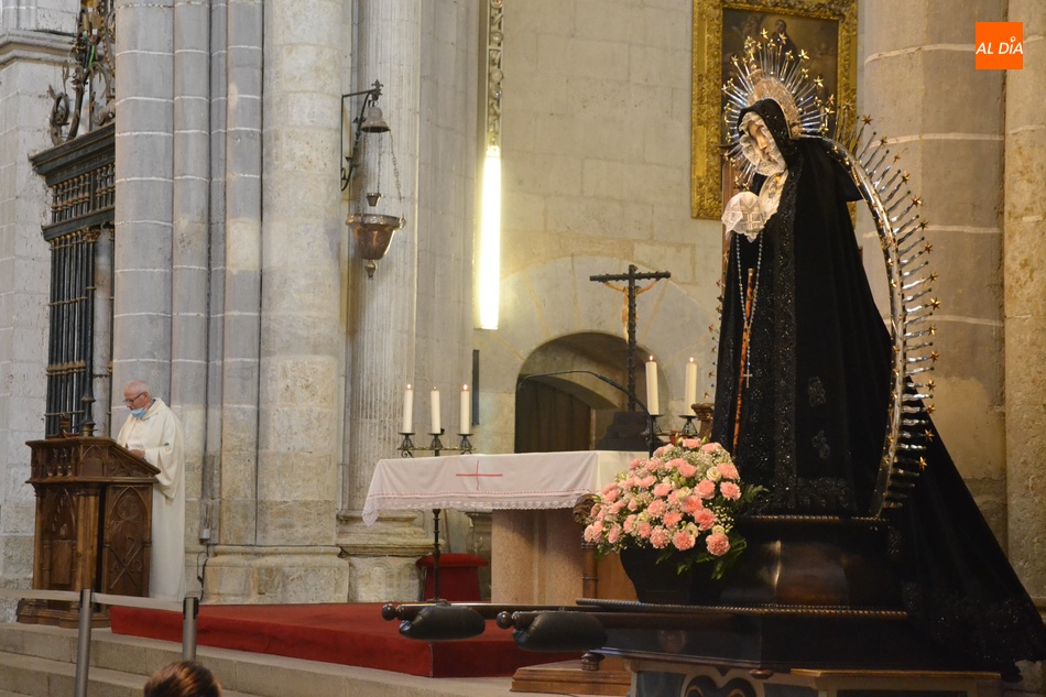 La Cofradía de Nuestra Señora de la Soledad de Ciudad Rodrigo recuperó en la tarde del domingo, tras no desarrollarse el año pasado por culpa de la pandemia del coronavirus, la tradicional conmemoración en la Catedral de Santa María de los Dolores de Nuestra Señora la Virgen, que aparecen en el calendario litúrgico el 15 de septiembre, pero que la entidad siempre traslada al tercer domingo de este mes.