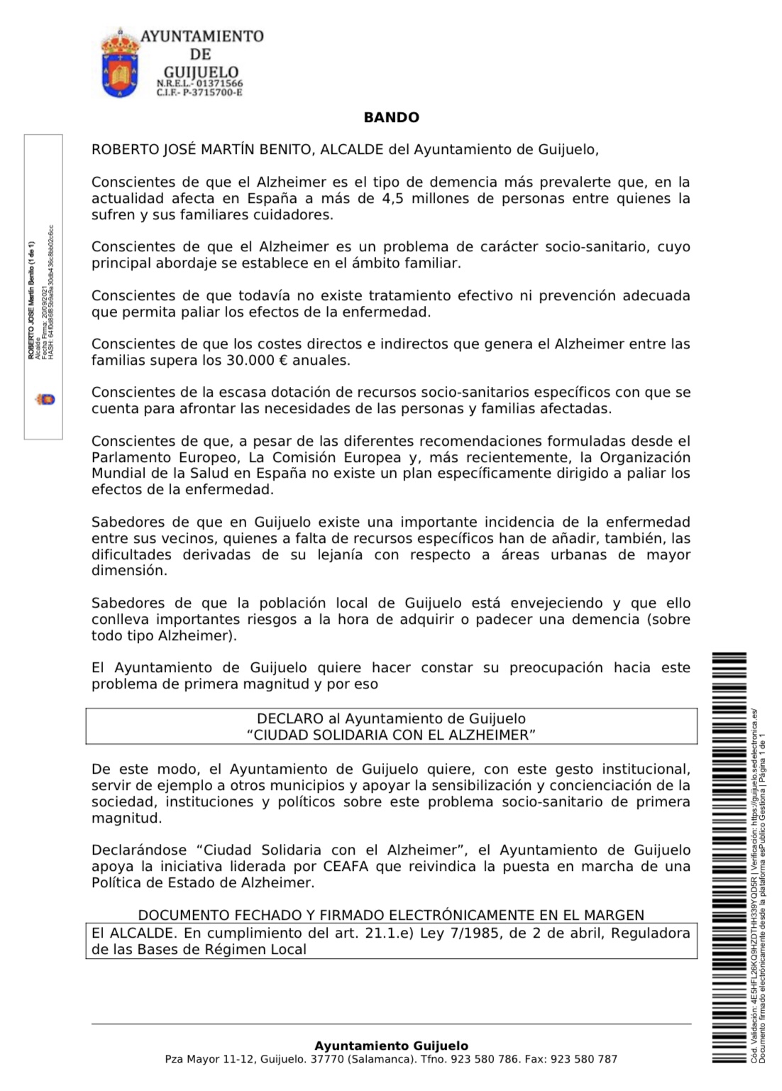 El Ayuntamiento de Guijuelo se ha declarado 'Ciudad Solidaria con el Alzheimer', con este gesto se suma, en el Día Internacional del alzheimer a la concienciación y visibilización de la enfermedad y lo hace a través de un bando.