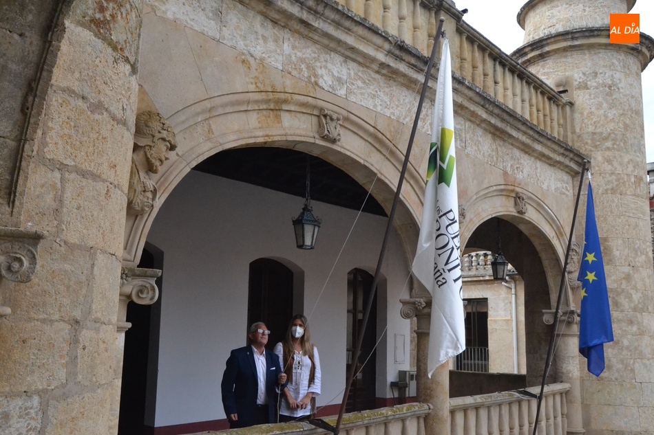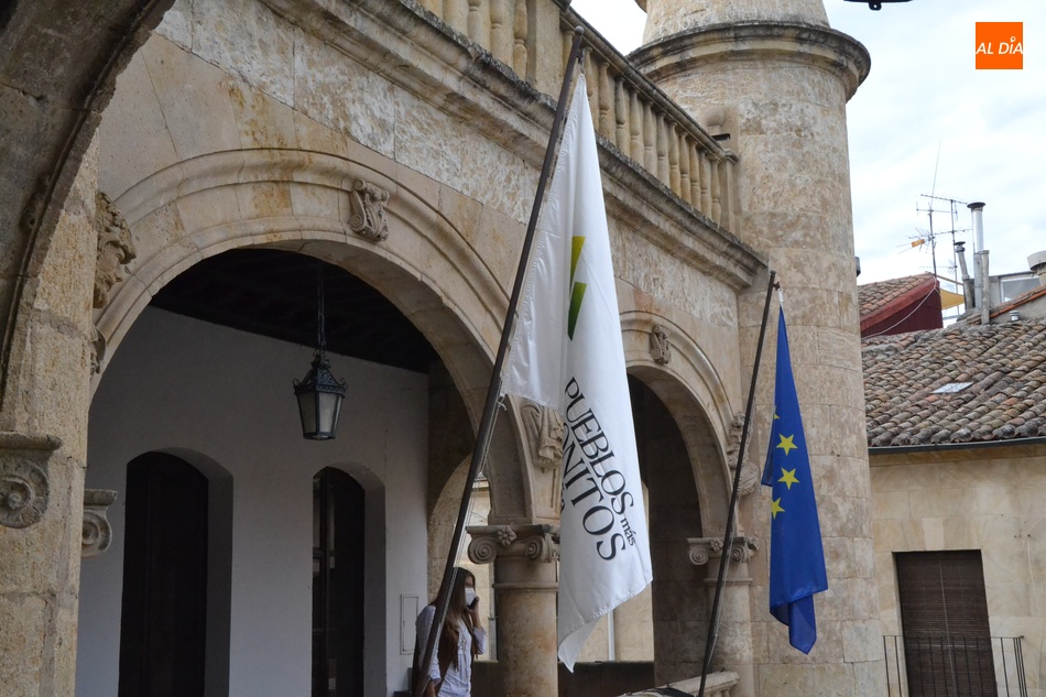La fachada de la Casa Consistorial de Ciudad Rodrigo luce entre sus banderas este viernes 1 de octubre una diferente a lo habitual, ya que se ha incorporado la de la Asociación de Los Pueblos más Bonitos de España de la que forma parte Miróbriga, para sumarse a la celebración del Día de esta Asociación, que precisamente este fin de semana (desde el viernes hasta el domingo) tiene su IX Asamblea Nacional en Peñíscola (Castellón).