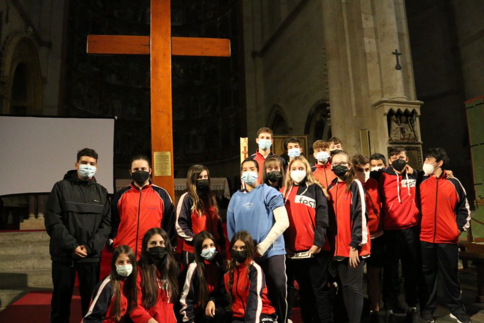 En la Catedral Vieja tuvo lugar un encuentro con 476 jóvenes de ESO y Bachillerato de 12 centros salmantinos, entre ellos, un grupo de Ciudad Rodrigo, a los que se les presentó ambos símbolos ubicados en el altar. Tras una lectura del Evangelio de San Juan, se les invitó a reflexionar sobre: "Y tú, ¿qué harías por el mundo?". El encuentro, dividido en dos grupos de más de 200 alumnos, concluyó con la oración "Instrumentos de paz", de San Francisco de Asís. Uno a uno, los jóvenes se acercaron a la Cruz de las Jornadas Mundiales de la Juventud para hacer un gesto de adoración. Tal y como informa la Diócesis de Salamanca.