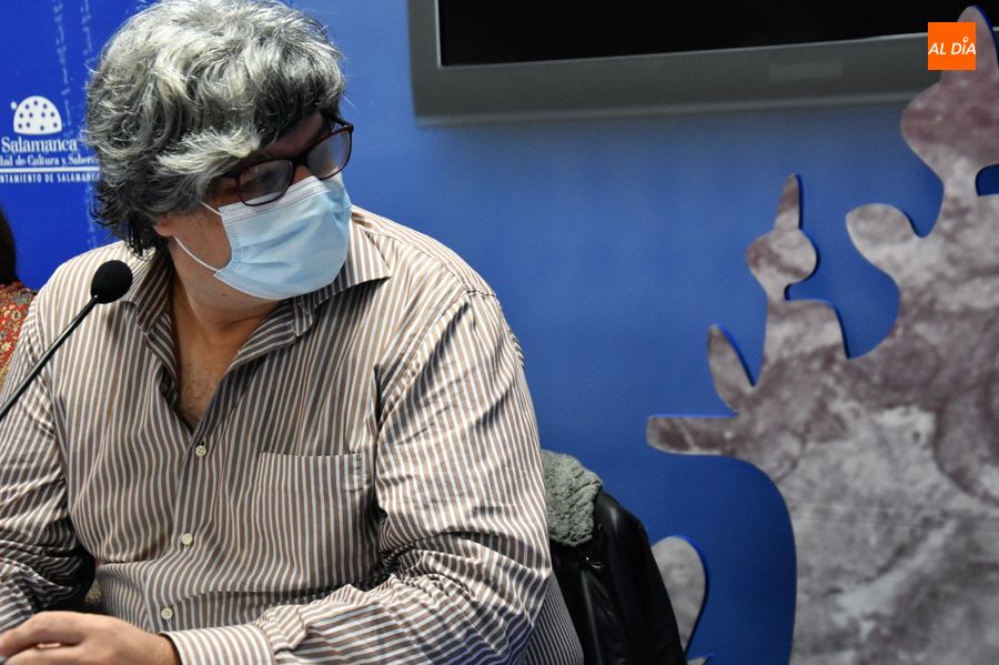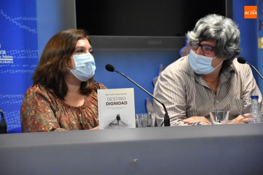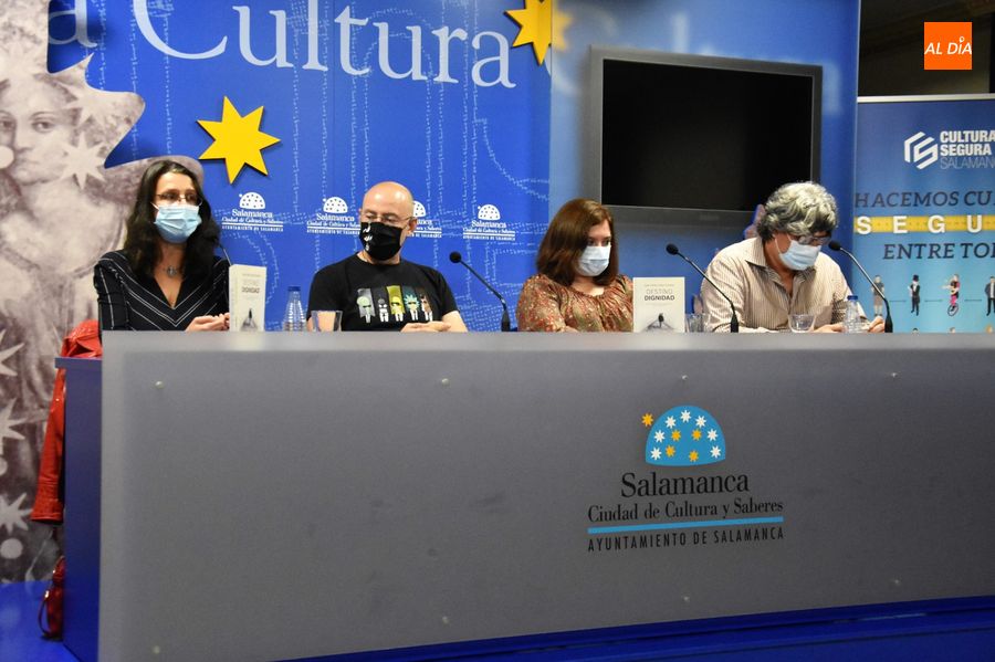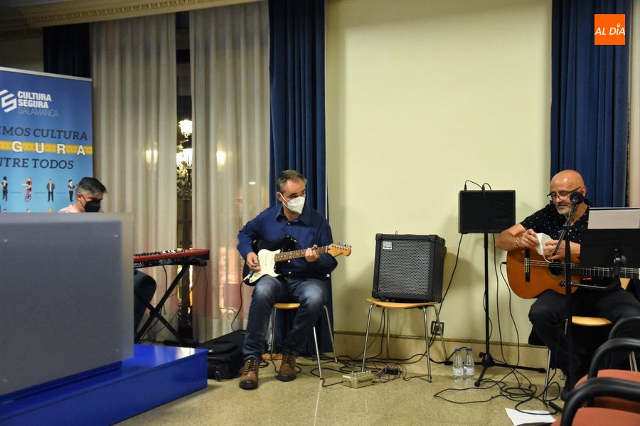 Hay libros que nacen bendecidos por el amor con el que se hacen a pesar de que se les atraviese por medio una pandemia. La presentación con retraso de Destino dignidad es una fiesta en esta sala hermosa del teatro Liceo donde Juan Carlos López Encinas tanto ha cantado. Pero ahora es solista de letras sin música, aunque ha querido acompañarse de la guitarra, de interpretar sus poemas, de la profunda calidez de Daniel Olivares, del teclado de José Luis Gómez y de la presentación de un divulgador de la música salmantina, Fernando Sánchez, que interpreta "a nuestro ritmo" la actualidad de esta Salamanca nuestra. Música no para camaleones, sino para quienes llenamos de calor y color esta sala azul para escuchar la música de Jimmy, maravillosamente editada como libro de poemas por Huerga y Fierro, una joya ilustrada por la visión cercana y comprometida de Carmen Borrego, artista y diseñadora gráfica, colaboradora de Salamanca rtv al día con sus fotografías y su visión amable y plena de entusiasmo de una Salamanca que une en una misma clave literatura, música, arte y amistad compartida..jpg)