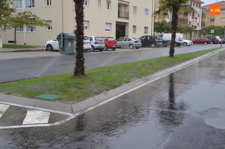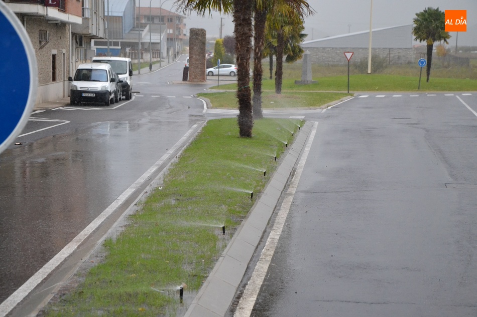 Tras el respiro general del Día de Todos los Santos, en el que lució el sol, la lluvia volvió a hacer acto de presencia en Ciudad Rodrigo a lo largo del martes, desde última hora de la mañana en adelante, cayendo con diferentes grados de intensidad de forma periódica. En uno de los tramos en los que el líquido elemento cayó del cielo con más fuerza, en la sobremesa del martes, una zona verde mirobrigense recibió agua por partida doble. Fue en concreto la isleta recientemente creada en el Paseo de Carmelitas cerca de la rotonda que la conecta con la Avenida de Arcachon, donde al mismo tiempo que estaba lloviendo con fuerza estaban funcionando los aspersores, contribuyendo también éste agua a los charcos que se habían formado junto a la isleta.