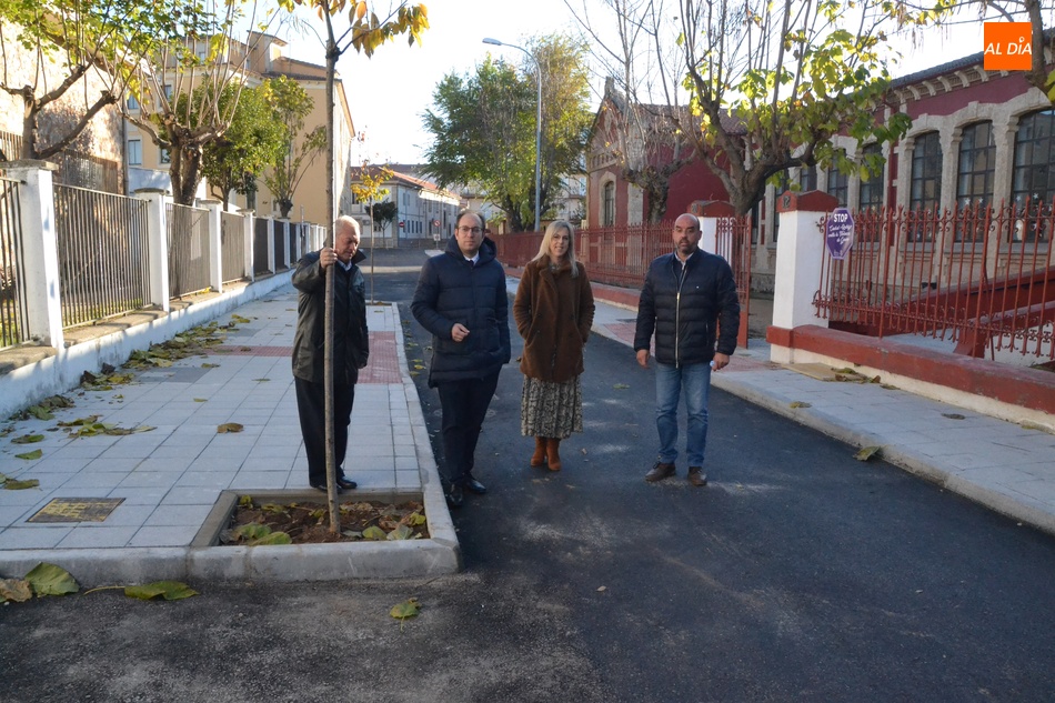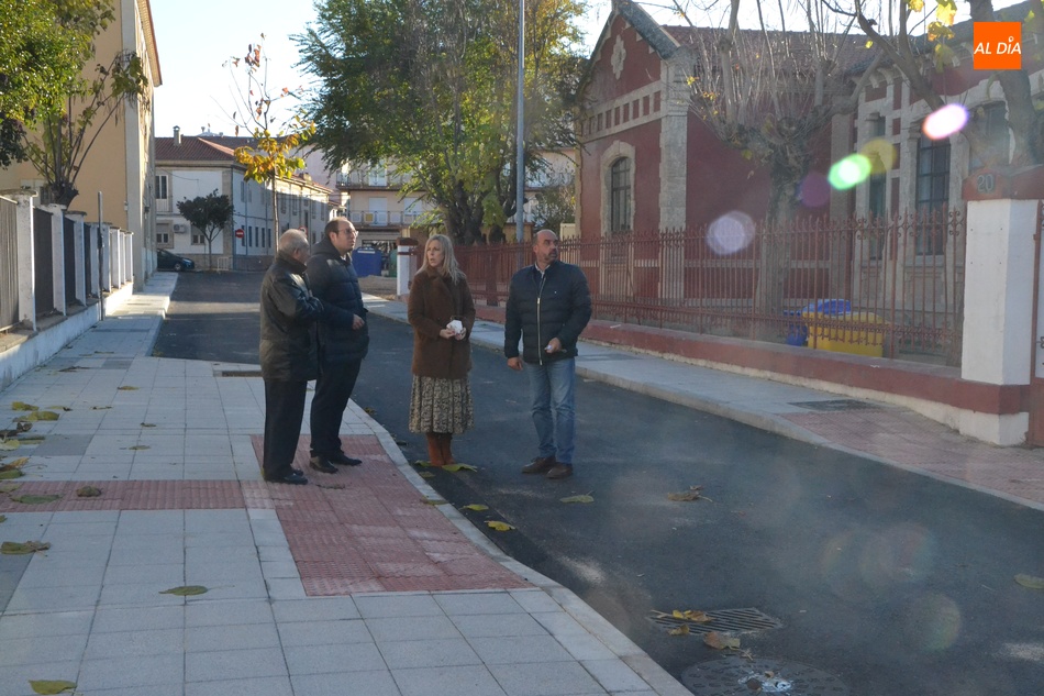 Aunque todavía no ha sido 'recepcionada', porque la empresa adjudicataria tiene que solventar algunas deficiencias, amén de que este viernes [finalmente comezó en la misma mañana del jueves] se va a pintar la señalización viaria (incluidas dos novedosas señales impresas en el suelo, una advirtiendo de la entrada de niños a centros educativos, y otra de Stop), el alcalde Marcos Iglesias, junto a los concejales José Manuel Jerez, Ramón Sastre y Beatriz Jorge Carpio se acercaron a visitar a primera hora de la mañana del jueves el nuevo aspecto casi concluido de la calle Escuelas.