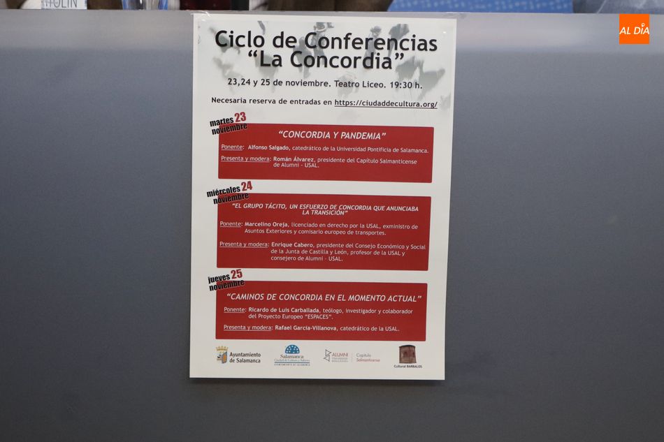 La próxima semana el Teatro Liceo acogerá el ciclo de conferencias La Concordia, organizado por el Ayuntamiento de Salamanca, a través de la Fundación Salamanca Ciudad de Cultura y Saberes, Capítulo Salmanticense de Alumni ? Universidad de Salamanca y Cultural Barbalos.