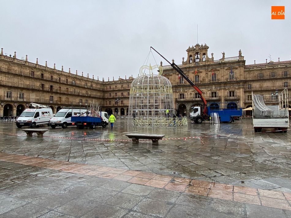 Este lunes comenzaban a montar en la Plaza Mayor la gran novedad de este año, en lo que a los adornos navideños de la ciudada se refiere. Se trata de de la instalación de una campana de 13 metros de altura, inspirada en la campana grande de la Catedral, conocida popularmente como 'María de la O', que sustituirá al motivo luminoso en forma de regalo que en los últimos años se colocaba en el centro del ágora.