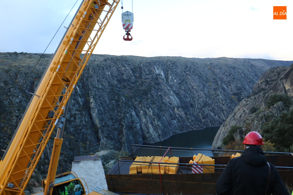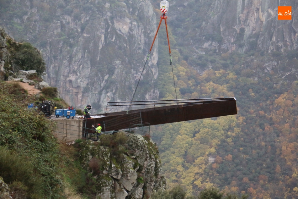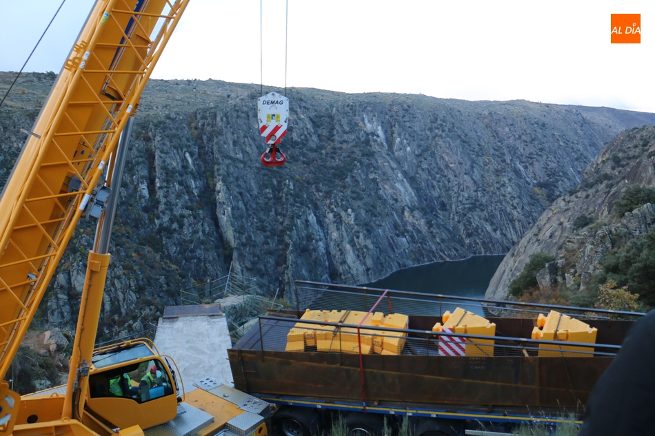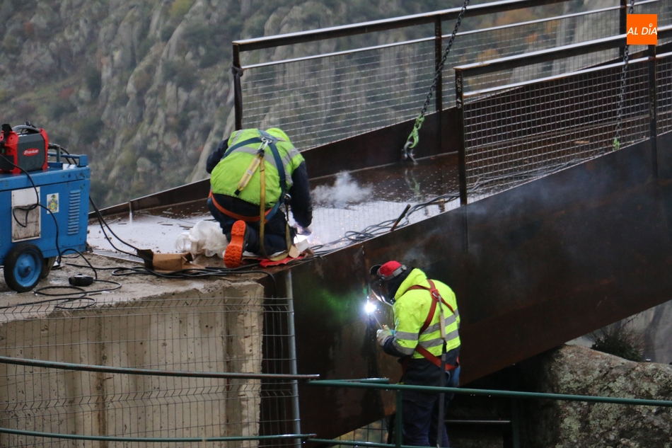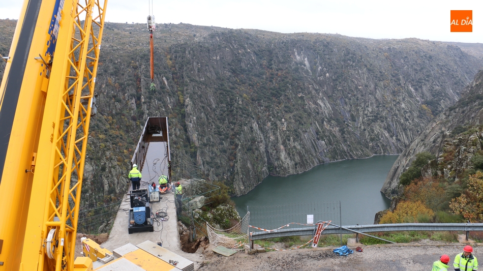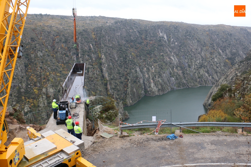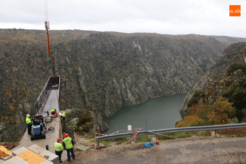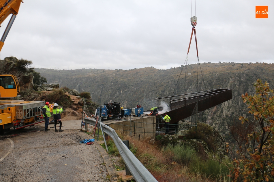 Operarios de la empresa Construcciones y Obras Valbuena, adjudicataria de las obras, procedían este martes a la instalación de la pasarela del nuevo mirador del Fraile en Aldeadávila de la Ribera, proyecto promovido por la Fundación Patrimonio Natural de Castilla y León, y cuyo coste asciende a 175.000 euros, que serán financiados con cargo al programa de Infraestructuras Turísticas en Áreas Naturales.