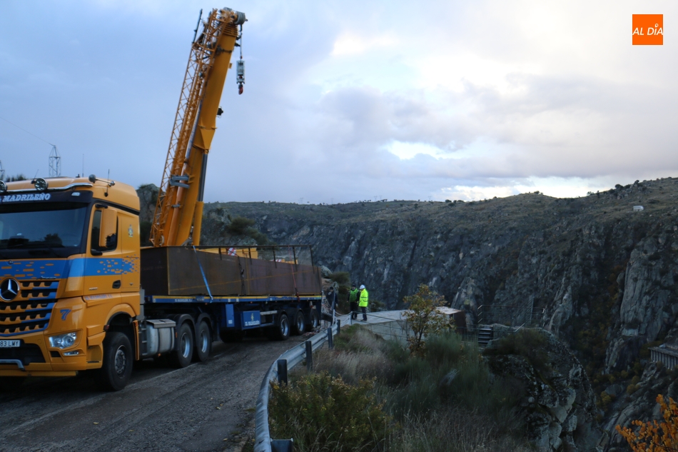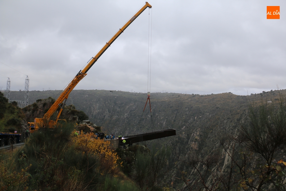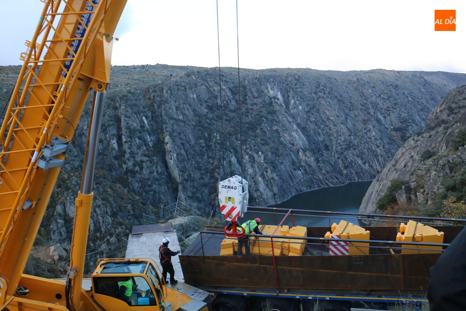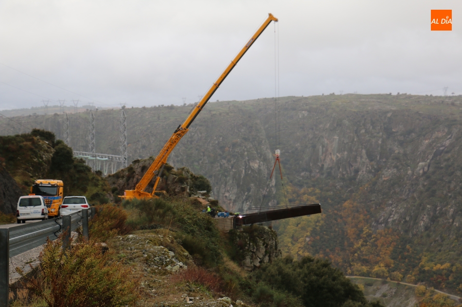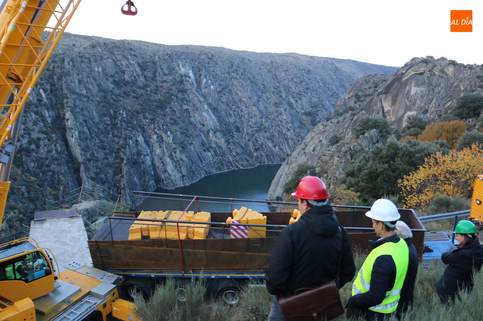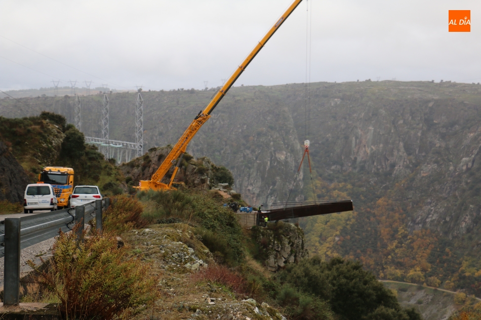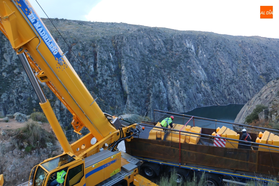 Operarios de la empresa Construcciones y Obras Valbuena, adjudicataria de las obras, procedían este martes a la instalación de la pasarela del nuevo mirador del Fraile en Aldeadávila de la Ribera, proyecto promovido por la Fundación Patrimonio Natural de Castilla y León, y cuyo coste asciende a 175.000 euros, que serán financiados con cargo al programa de Infraestructuras Turísticas en Áreas Naturales.