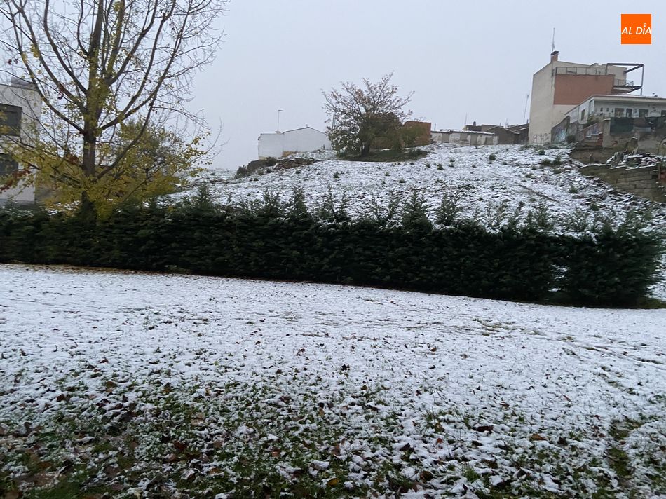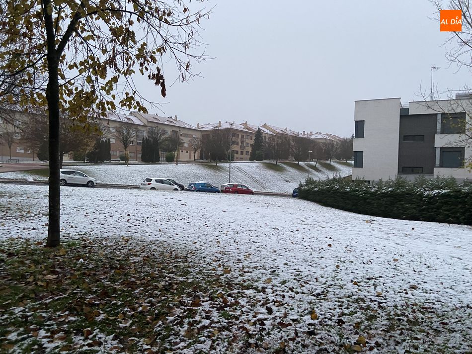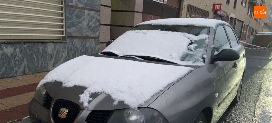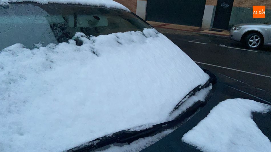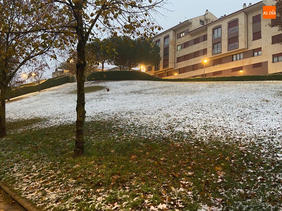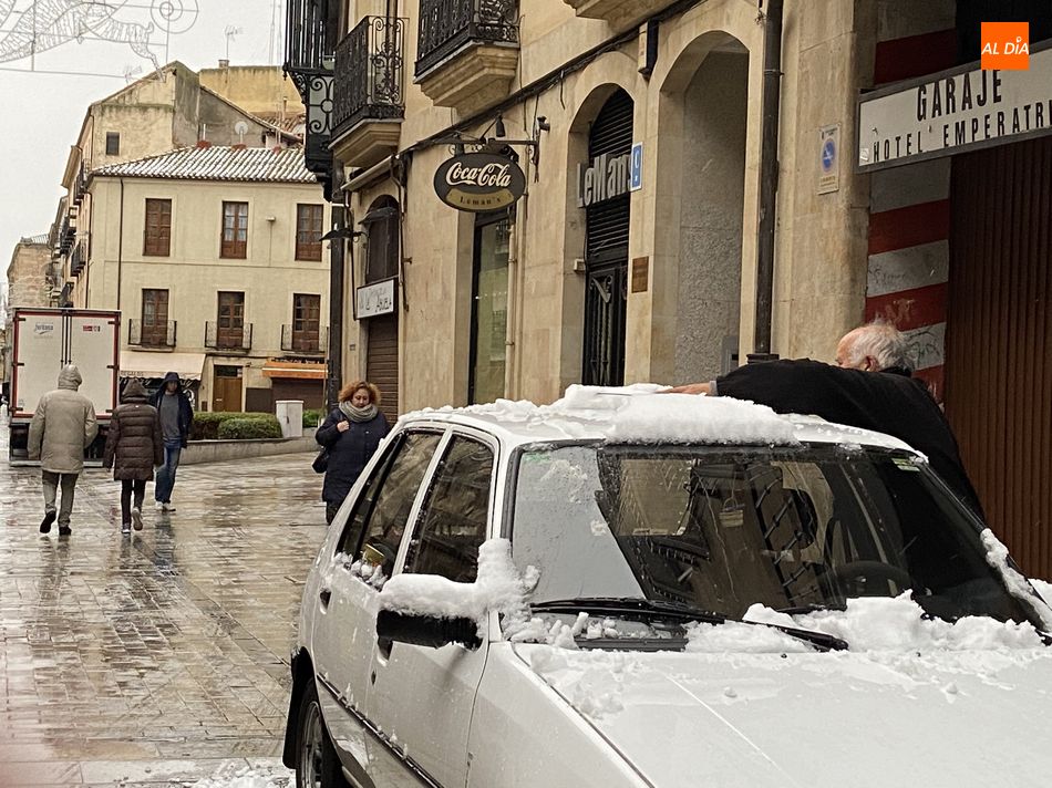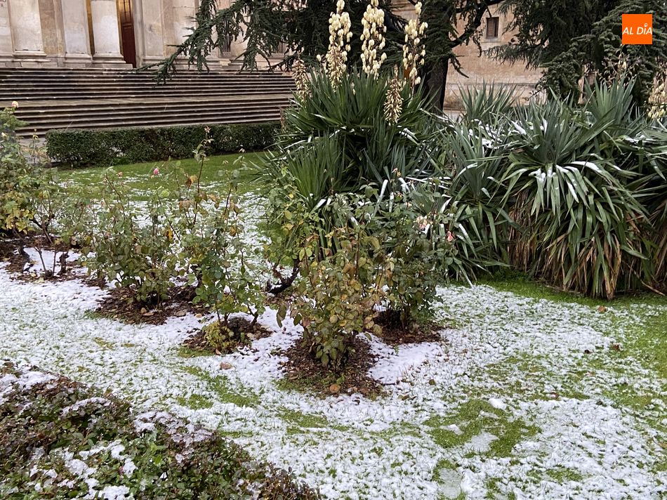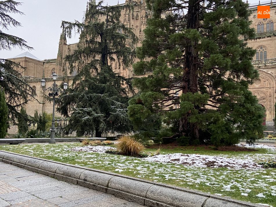 La nieve caída en las últimas horas en la ciudad charra ha dejado un tímido rastro, ya que la lluvia no permitió que cuajase como en otras ocasiones y solo se ha mantenido en coches, tejados y algunos jardines.
