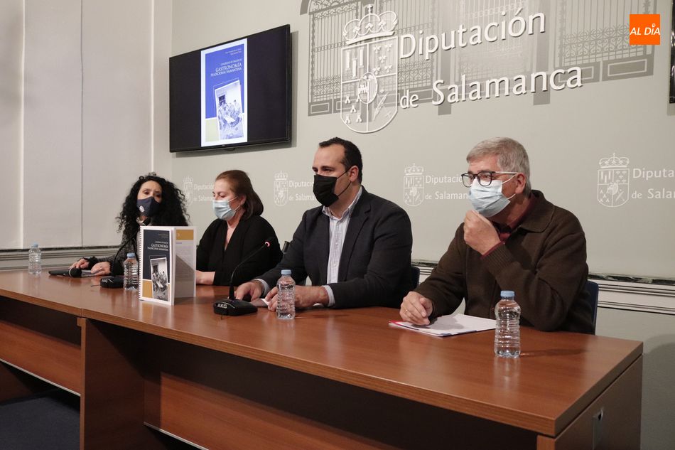 'Cuaderno de Taller de Gastronomía Tradicional Salmantina' es la publicación de la Diputación de Salamanca que se puede adquirir por 12 euros en las librerías y que esta mañana presentaban el diputado de Cultura, David Mingo, junto con las autoras del libro, María Fernanda Martín y María Boufard, y el director del Instituto de las Identidades de Salamanca (IDES), Juan Francisco Blanco.