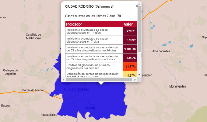 La otra localidad en esa situación es Ciudad Rodrigo, pese a que bajan los datos de incidencia acumulada tanto semanal como quincenal en ese grupo de mayores de 65 años al cumplir cierto número de positivos la semana y las dos semanas de antigüedad. Asimismo, este martes también se refleja un descenso del dato de incidencia semanal general respecto al que figuraba el viernes en la última actualización, pese a lo cual se sabe que Ciudad Rodrigo ha registrado nuevos positivos estos días.