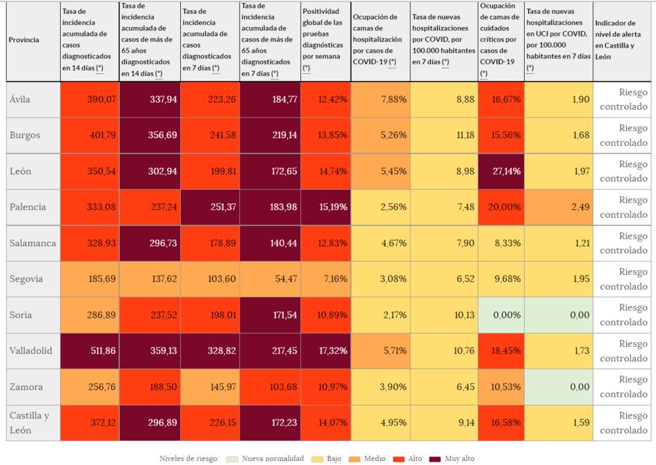 Respecto al semáforo Covid, Salamanca mantiene dos indicadores en 'riesgo muy alto'. Se trata de la incidencia acumulada en la población mayor de 65 años (a 14 días se sitúa en 296 casos y a 7 días en 140).