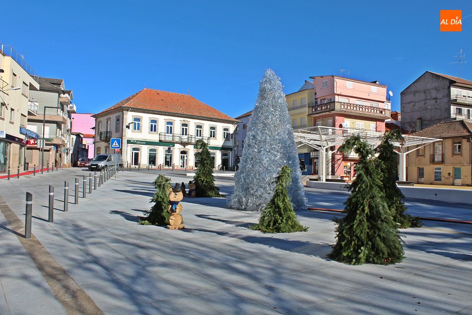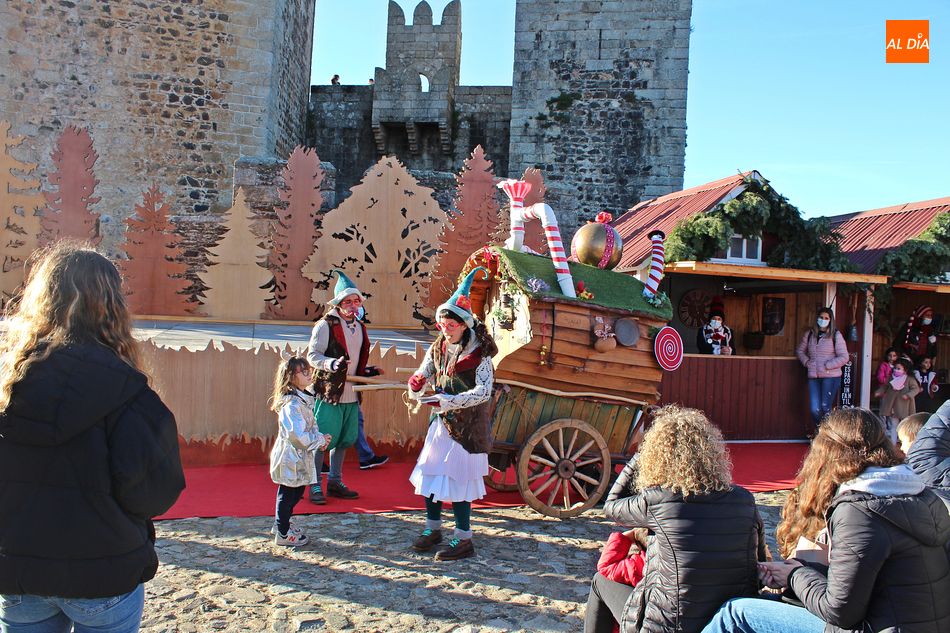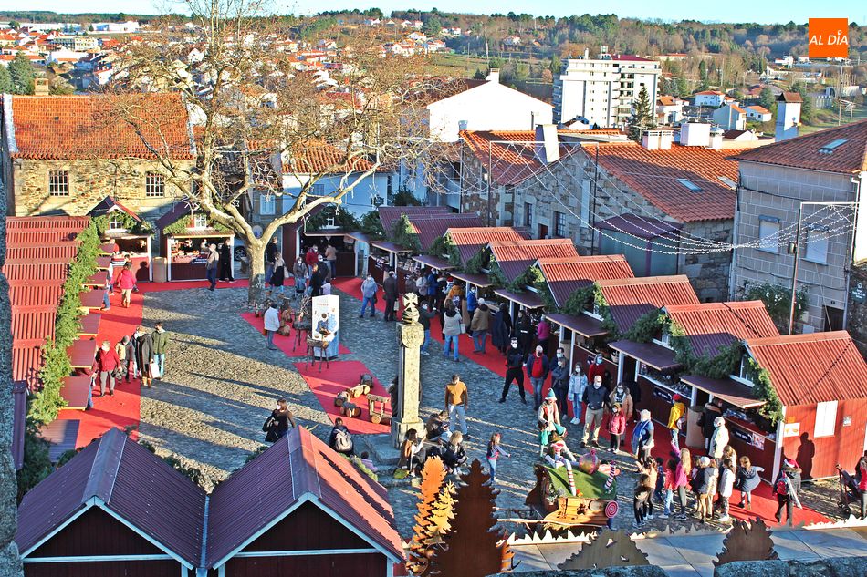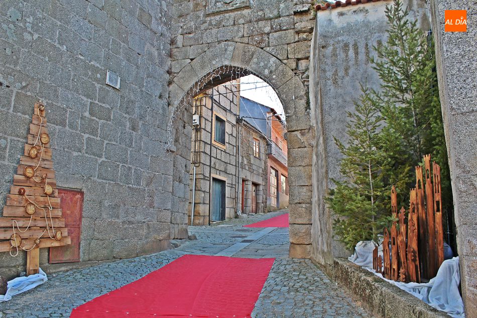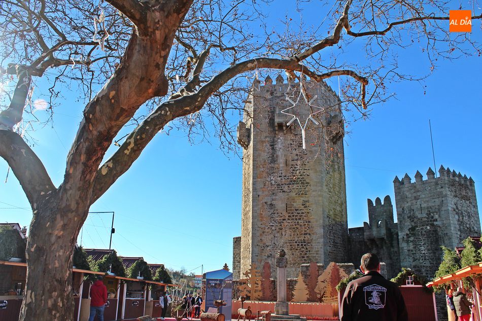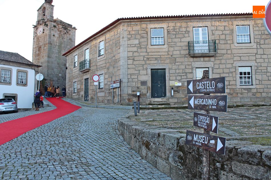 Desde la decoración navideña del Largo da Fonte, en el centro contemporáneo de la ciudad, seguimos la senda marcada por la alfombra roja y subimos por la Rua 5 de octubre, descubriendo las Estrelas de Natal, realizadas por colegios, residencias y otros centros sociales del concejo con materiales encontrados en la naturaleza. Llegamos hasta los Pazos del Concejo traspasando un mural con entradas a dos alturas: una para los adultos y otra para los niños. Pasamos una segunda entrada, la de la Torre del Reloj, adosada a los restos de la antigua muralla, y seguimos subiendo, ya con la imagen del castillo como horizonte.