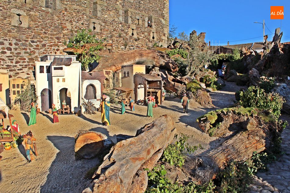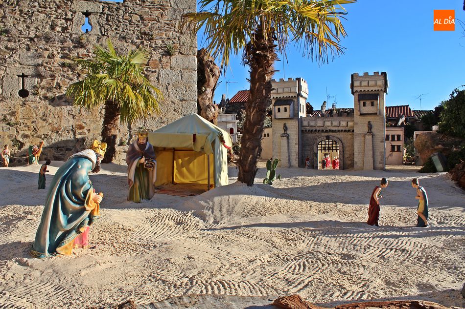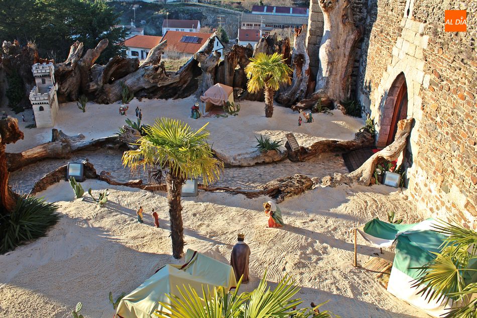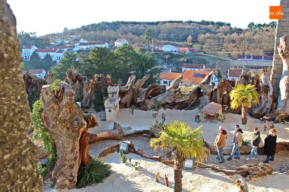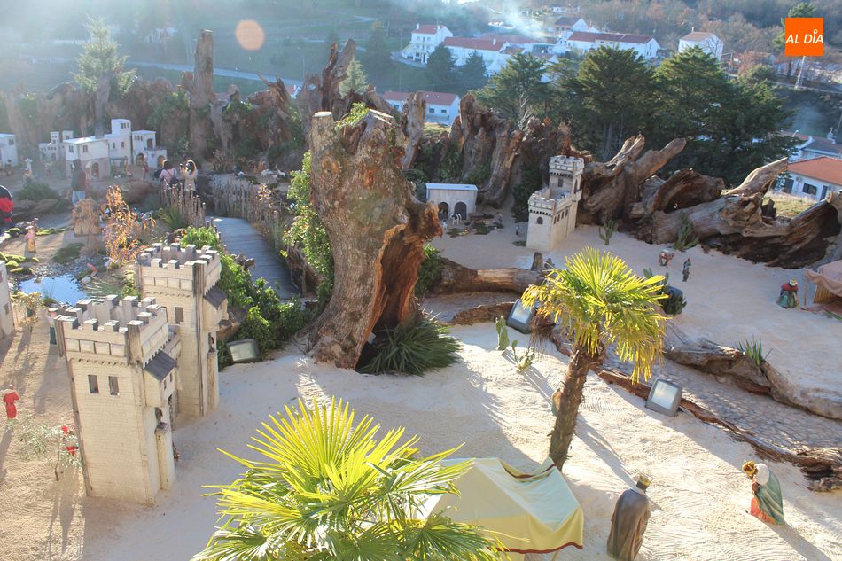 La escala del belén de Sabugal y su distribución favorecen que el visitante se sienta parte de él. Es posible sentarse en uno de los gruesos troncos a contemplar la Sagrada Familia en el portal, atravesar el puente sobre el río o descubrir a los Reyes Magos en su peregrinaje hacia Belén, desde unas tierras que parecen muy lejanas, pues en el paisaje hay palmeras, arena y cactus.