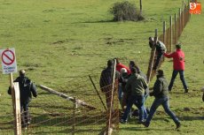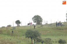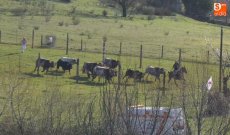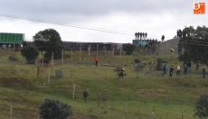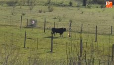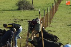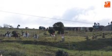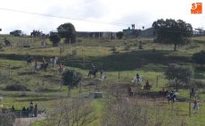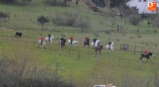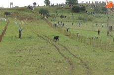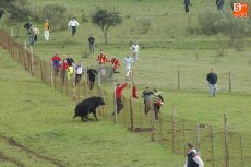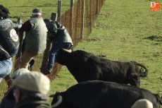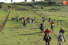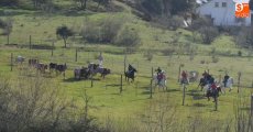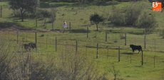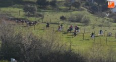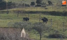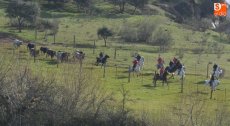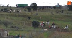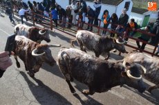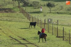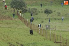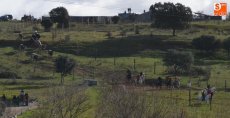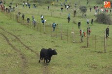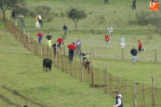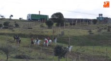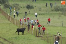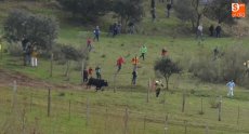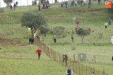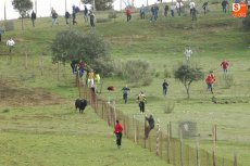 Con puntualidad, los astados sevillanos de Aguadulce protagonistas del encierro salieron de los corrales situados en lo alto del Teso de Valhondo. En los primeros metros, uno de los toros ya se quedó emplazado, perdiendo de vista al resto de la manada, que bajó por la ladera, esperándole más allá de la mitad de la misma la escasa docena de caballistas que tomaron parte en el encierro.
