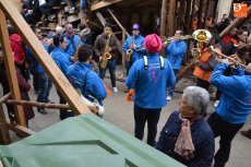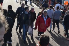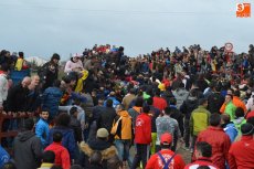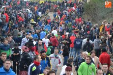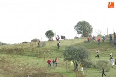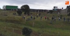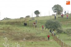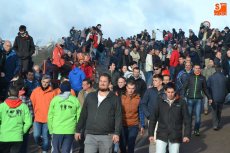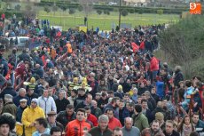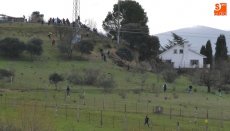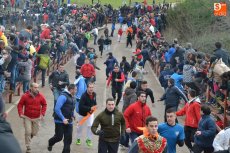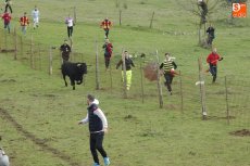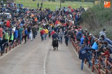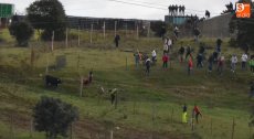 Posteriormente fue el turno de los corredores. Una vez se consiguió solventar el problema del mallazo roto, un numeroso grupo de personas empezó a subir por el lateral derecho de la ladera, para intentar hacer bajar a los dos toros que había dentro del recorrido. Con esfuerzo, dos mozos consiguieron hacer descender a los astados, uno detrás de otro.