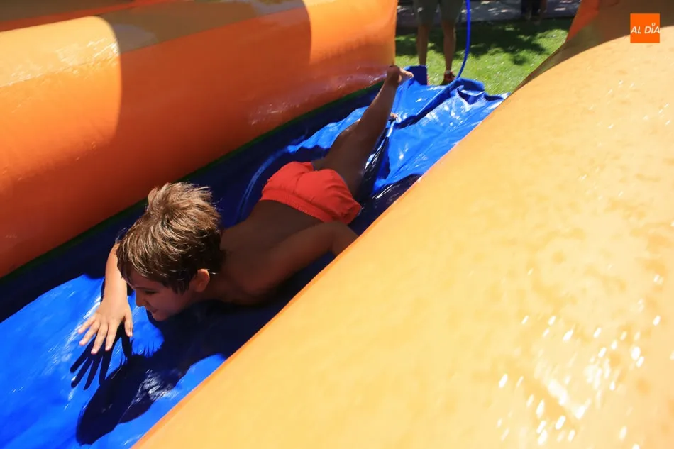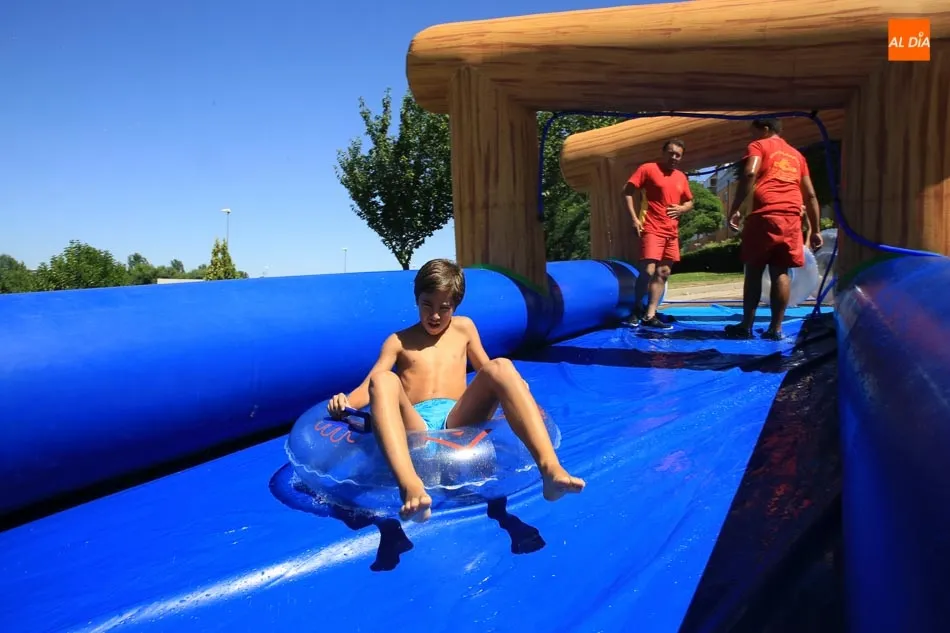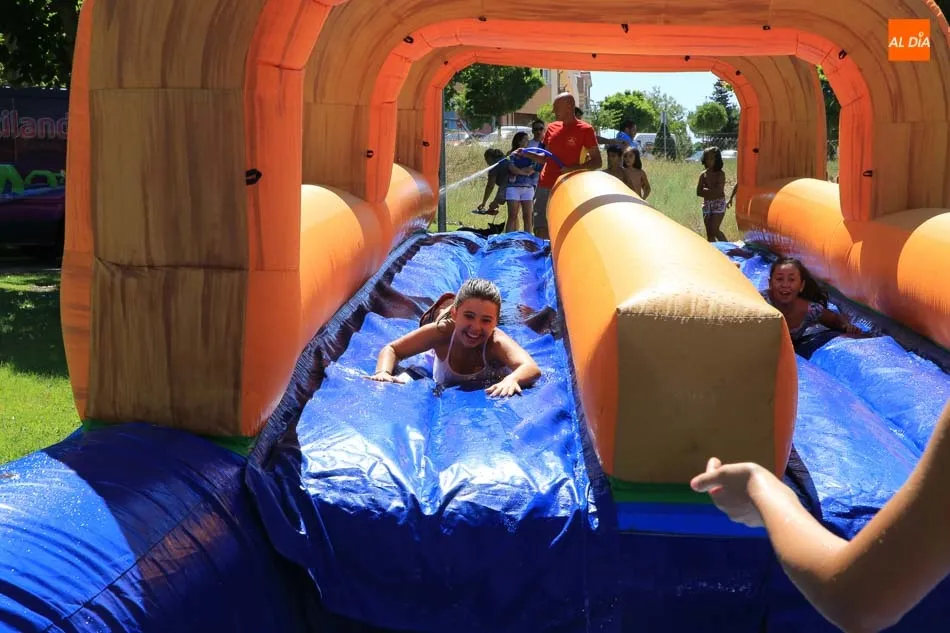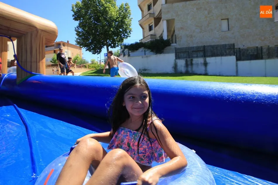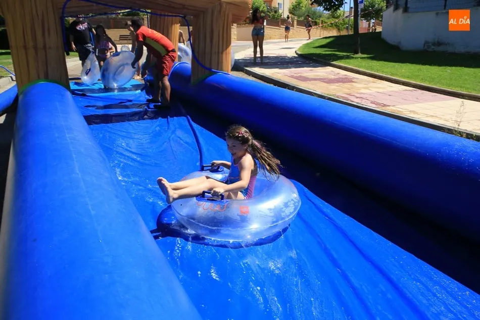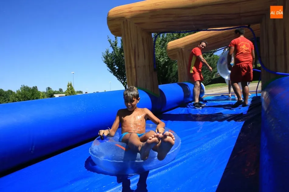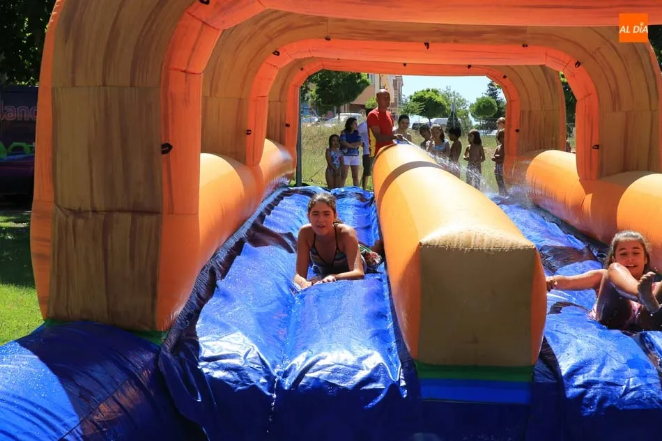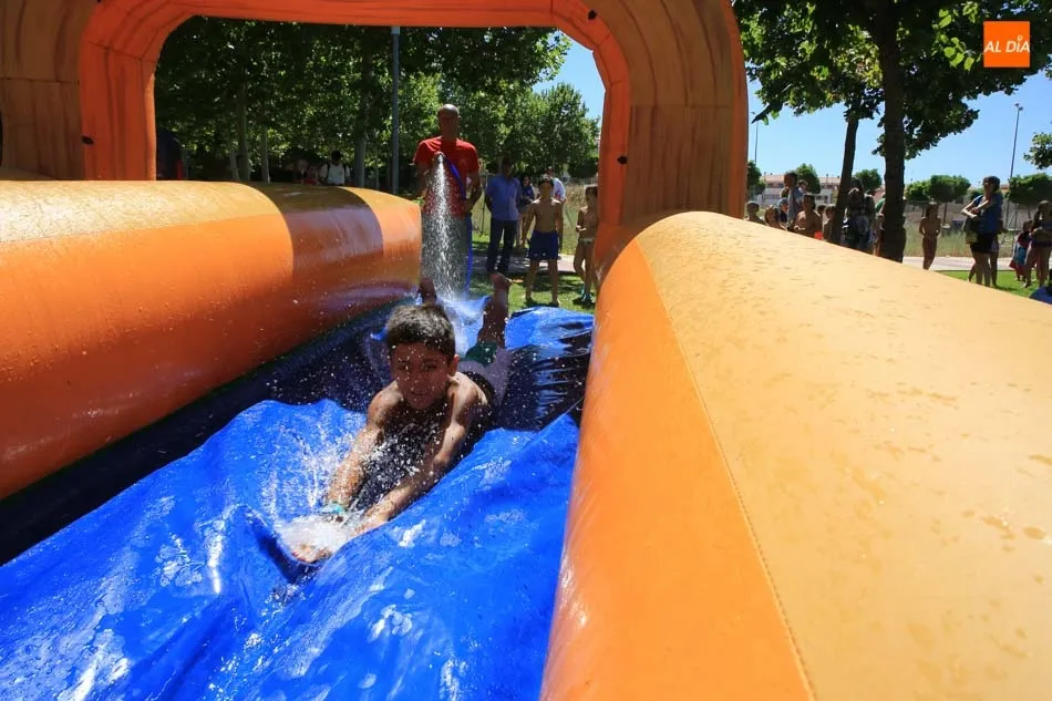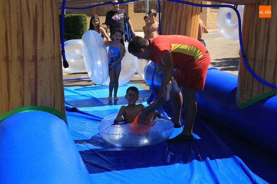 Las fiestas de San Roque, en Carbajosa de la Sagrada, siguen garantizando escenas divertidas, sobre todo para los más pequeños. Así, esta mañana, tenía lugar la Fiesta del Agua en el Prado de La Vega. Un atractivo programa acuático que incluía hinchables, tobogán y una gran rampa de 50 metros de largo, por la que desfilaron todos los participantes.